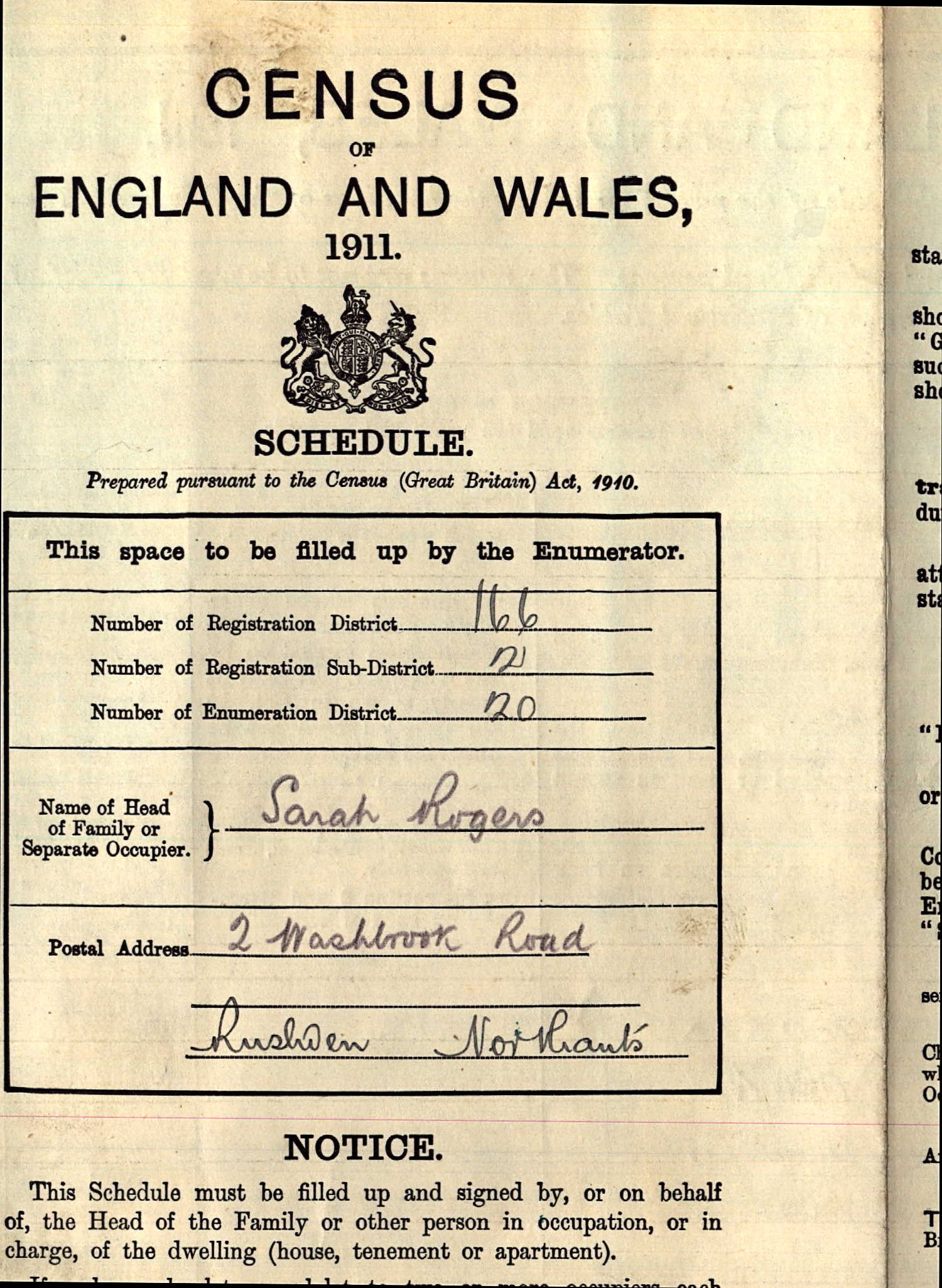 - was recorded in the census on 2 Apr, 1911 at Spencer Road, Rushden, Northamptonshire, England