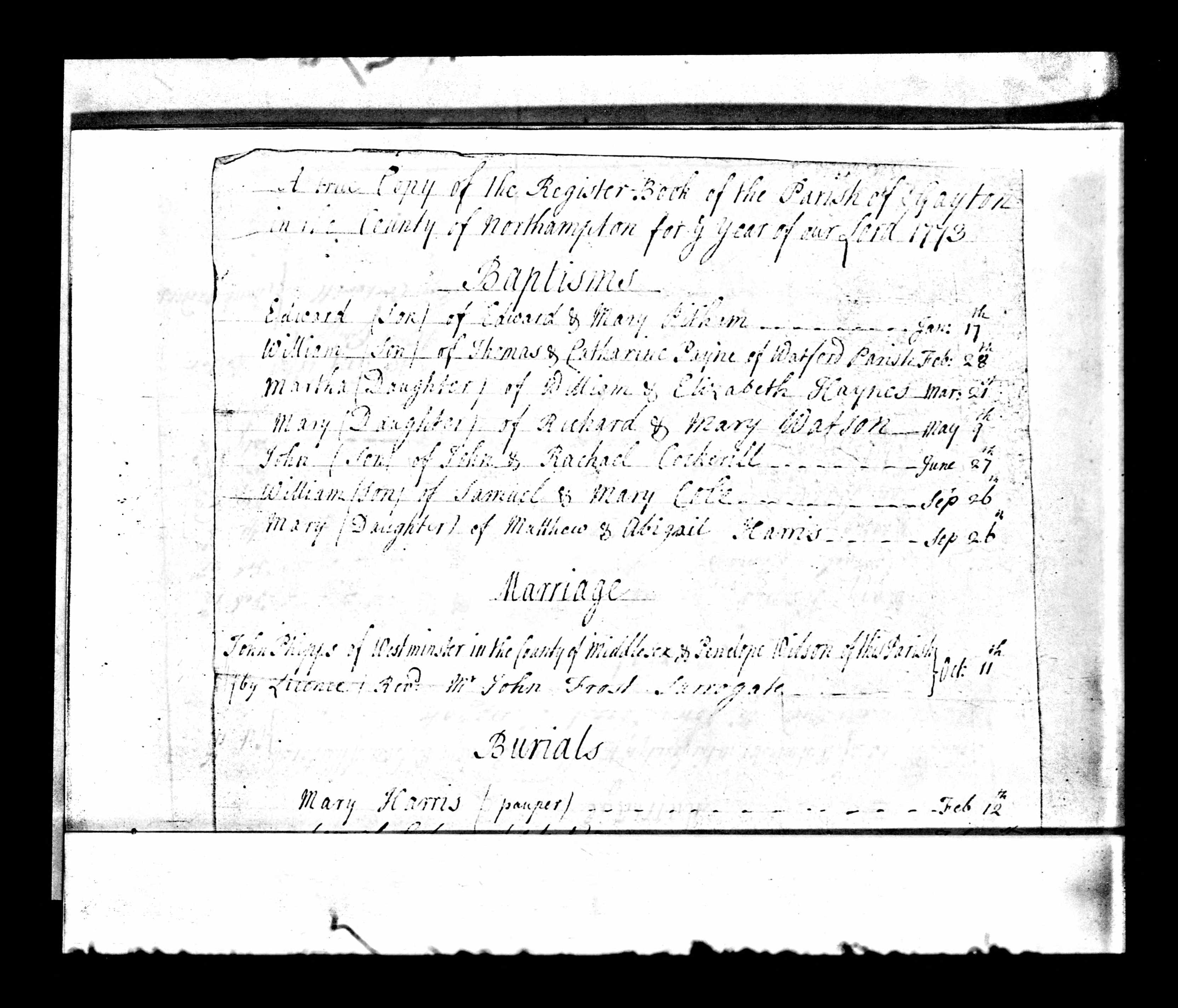Bishop's Transcripts for the Diocese of Peterborough, England; Baptism entry for Edward Pitham, Gayton, 17 Jan 1773.