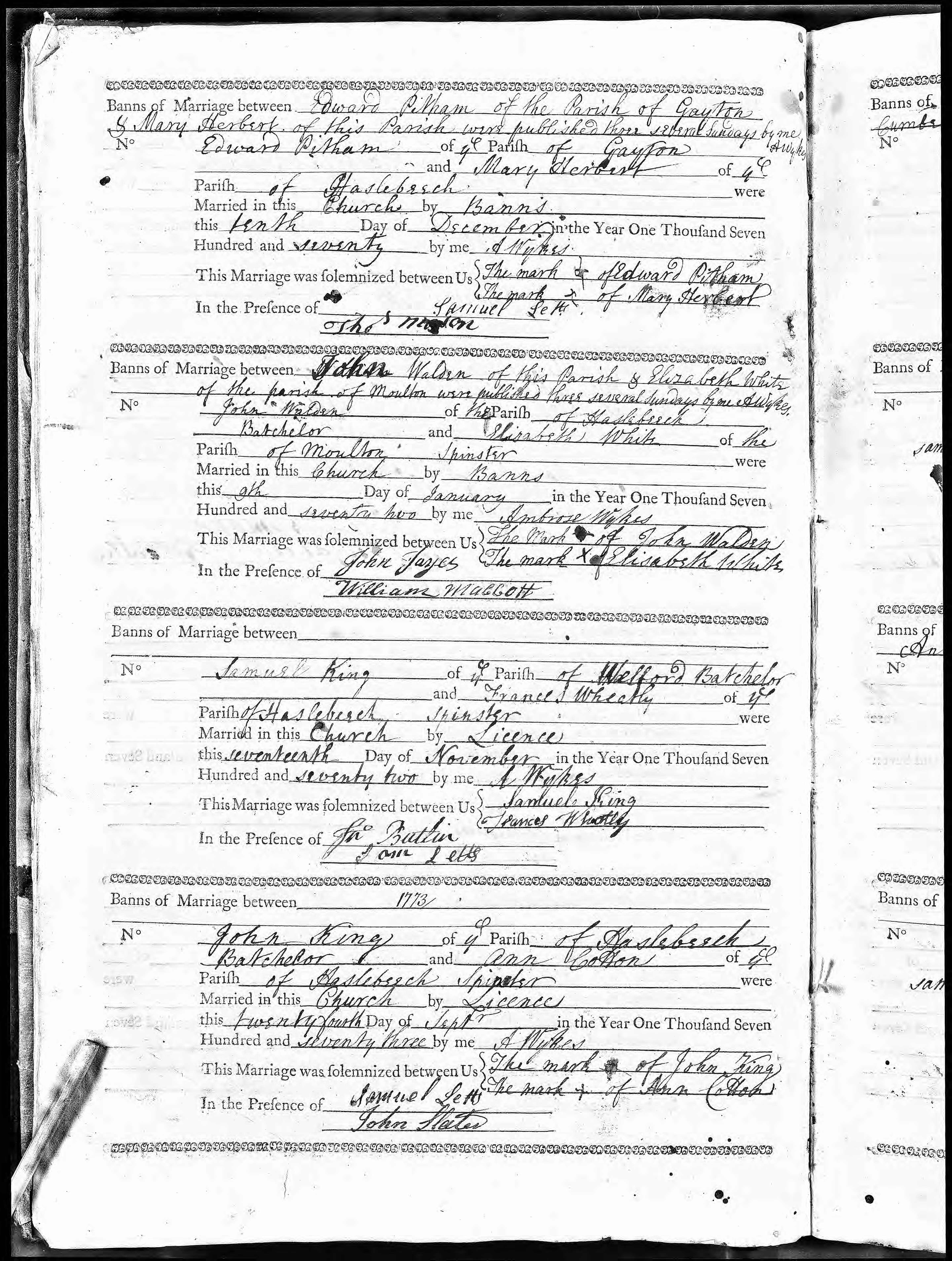 Edward Pitham, abode the Parish of Gayton and Mary Herbert, abode the Parish of Haslebech. Married by Banns. Groom could not sign name. Bride could not sign name. Witness: Samuel Letts (signed). Witness: Thos Mason (signed).