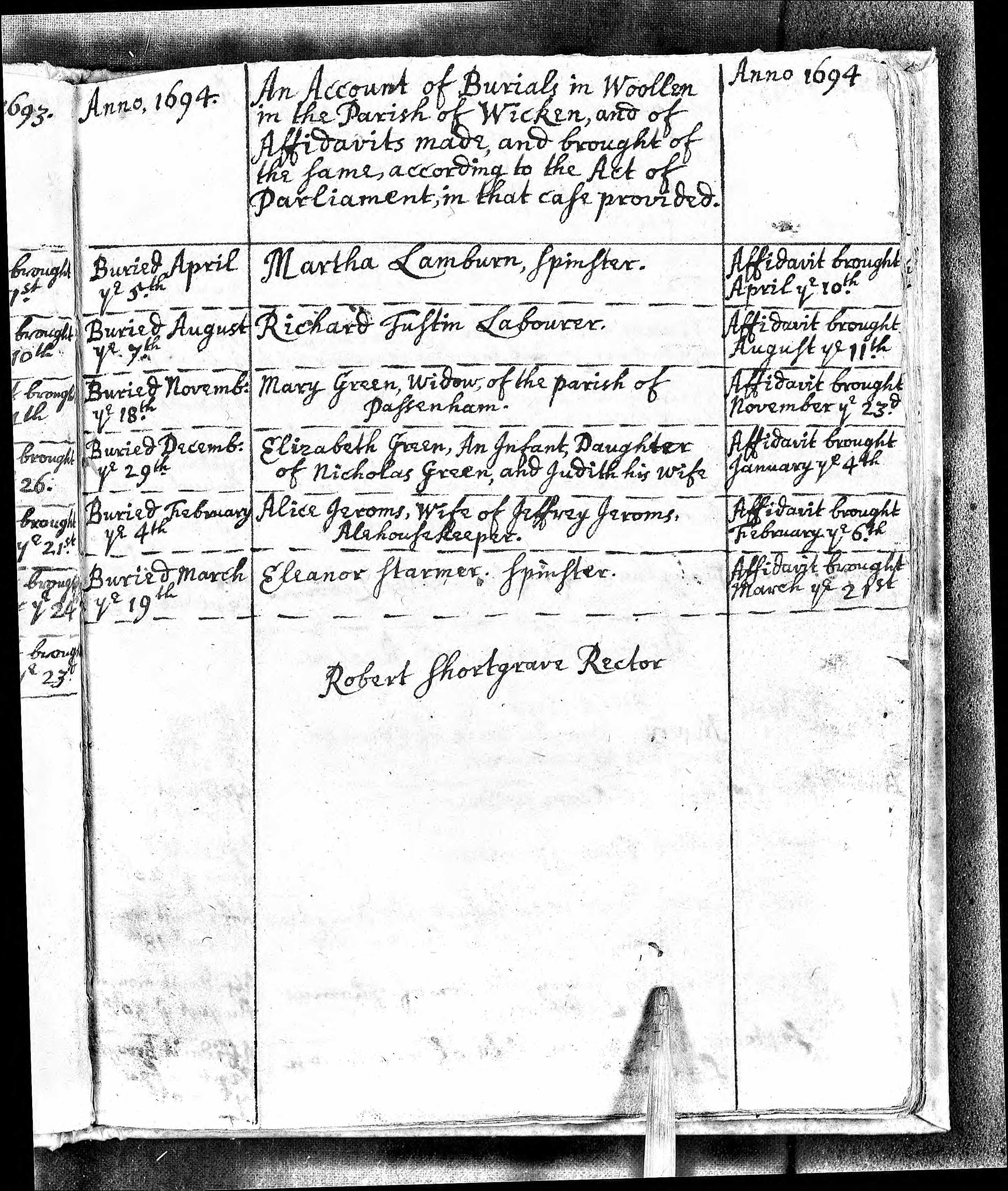 Parish Registers of St. John the Evangelist, Wicken, Northamptonshire; Burial entry for Richard Tustin, 7 Aug 1694.