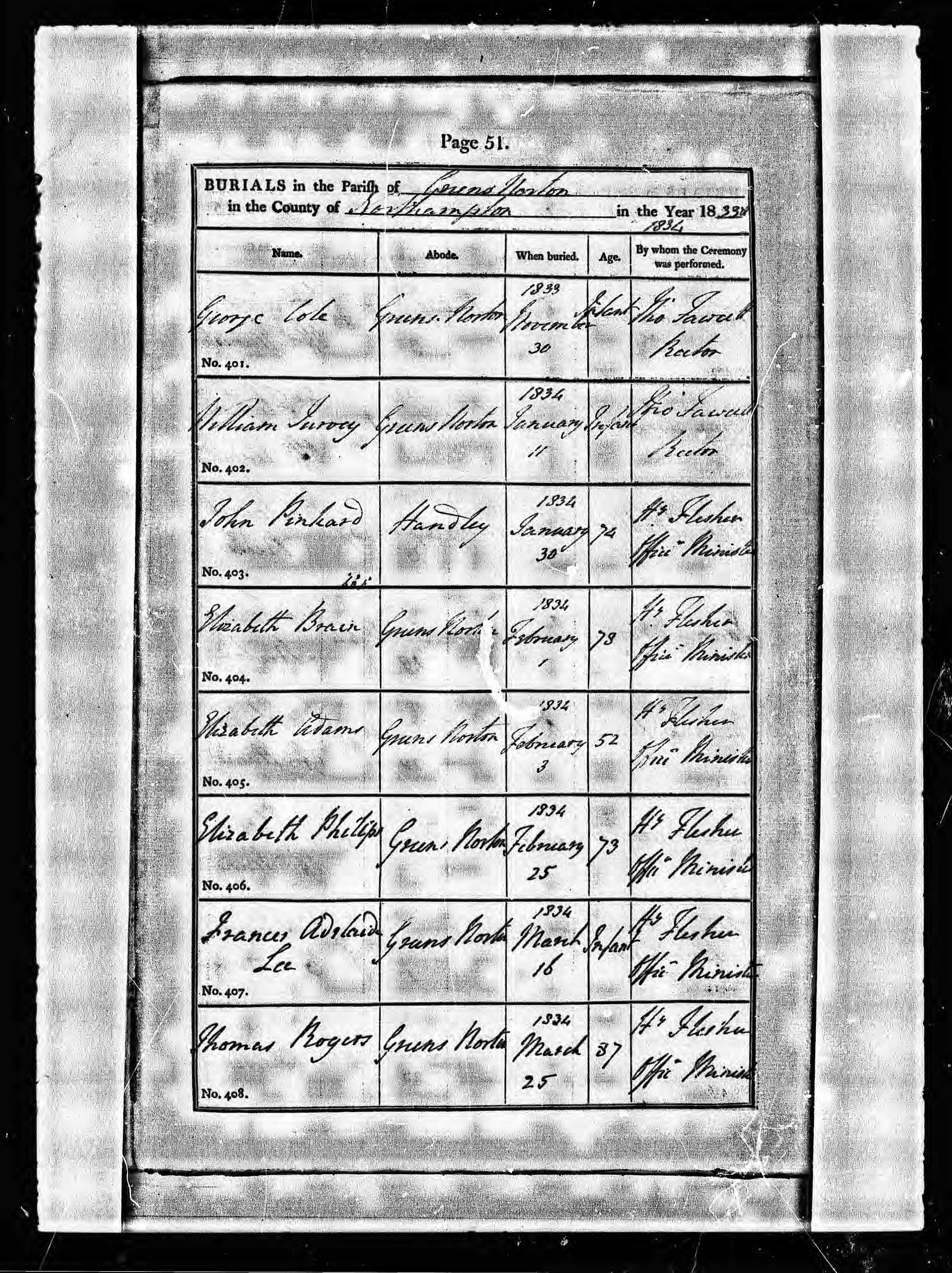 Parish Registers of St Bartholomew, Greens Norton, Northamptonshire; Burial entry for Thomas Rogers, 25 Mar 1834, Page 51, No 408.