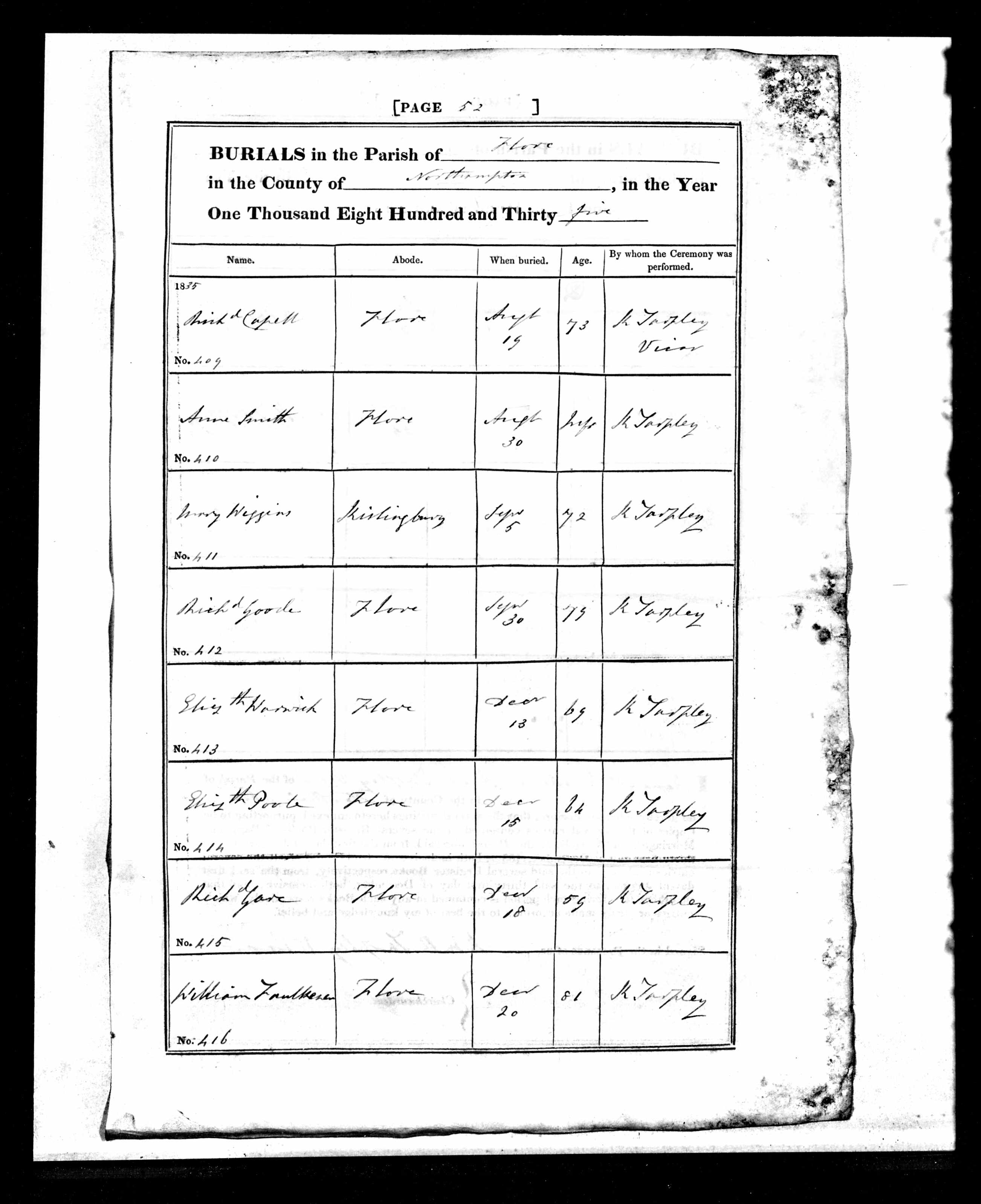 Bishop's Transcripts for the Diocese of Peterborough, England; Burial entry for Richd Goode, Flore, 30 Sep 1835, Page 52, No 412.