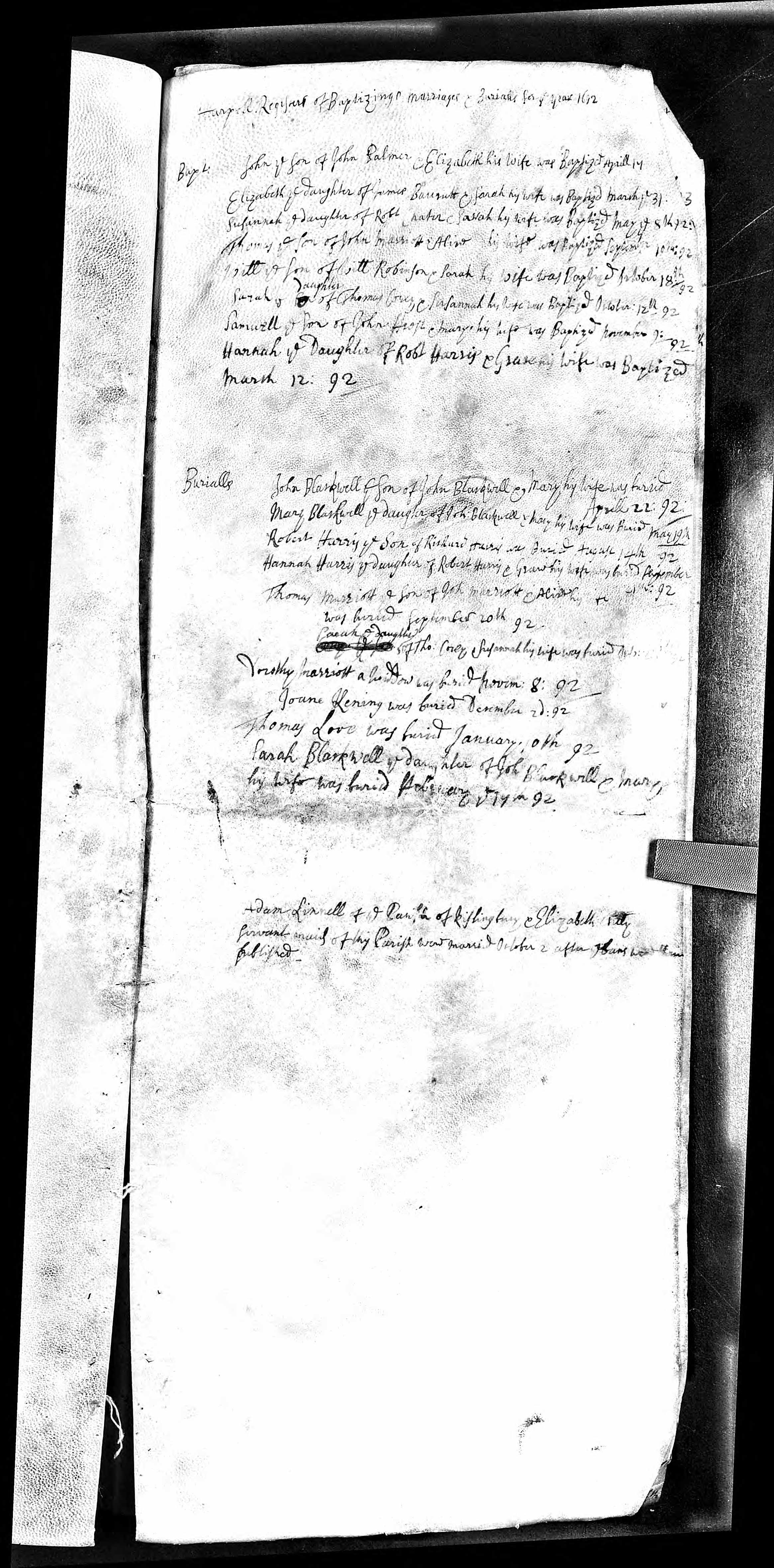 Parish Registers of All Saints, Harpole, Northamptonshire; Baptism entry for Elizabeth Barrutt, 31 Mar 1692.