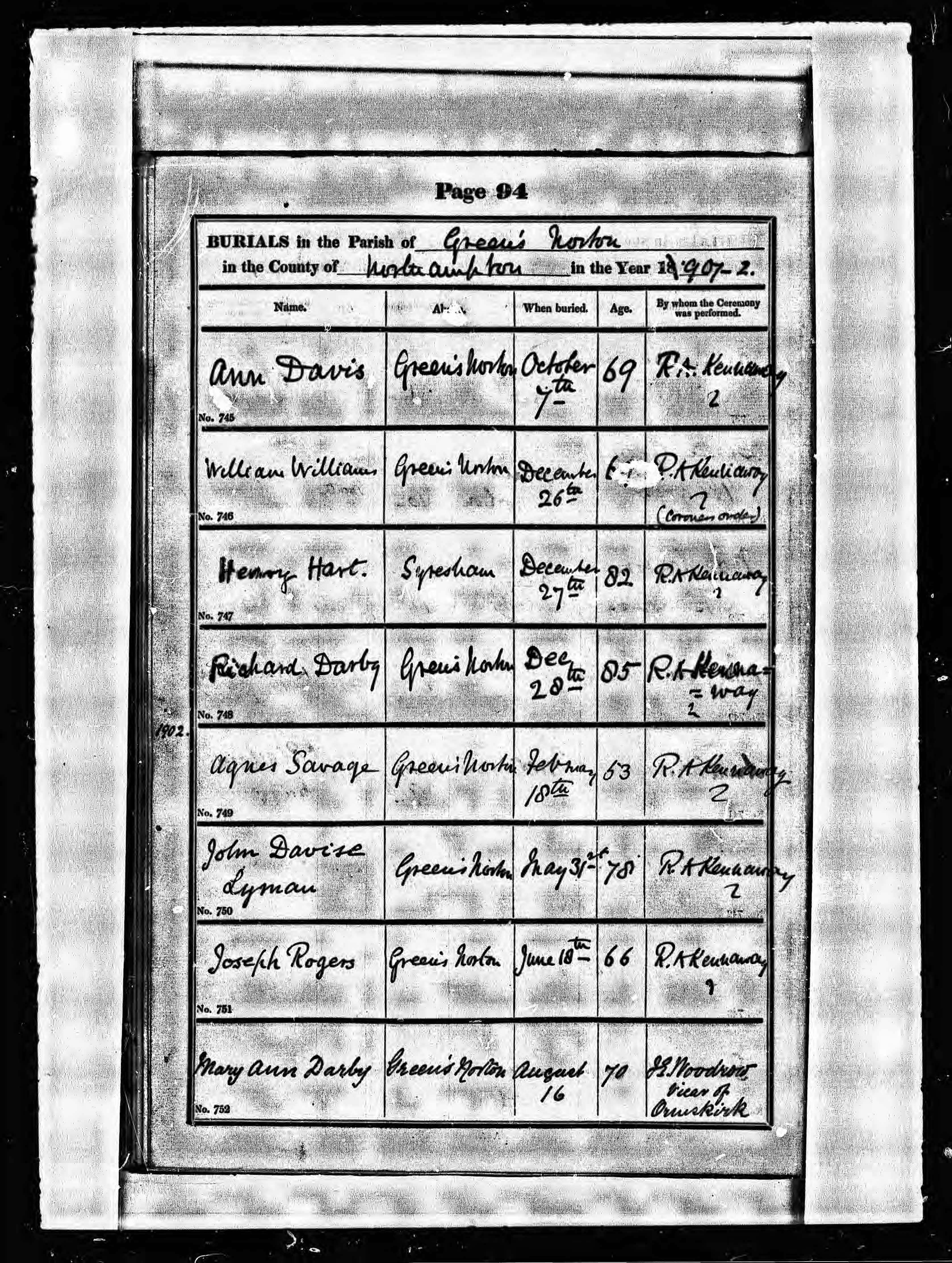 Parish Registers of St Bartholomew, Greens Norton, Northamptonshire; Burial entry for Joseph Rogers, 18 Jun 1902, Page 94, No 751.