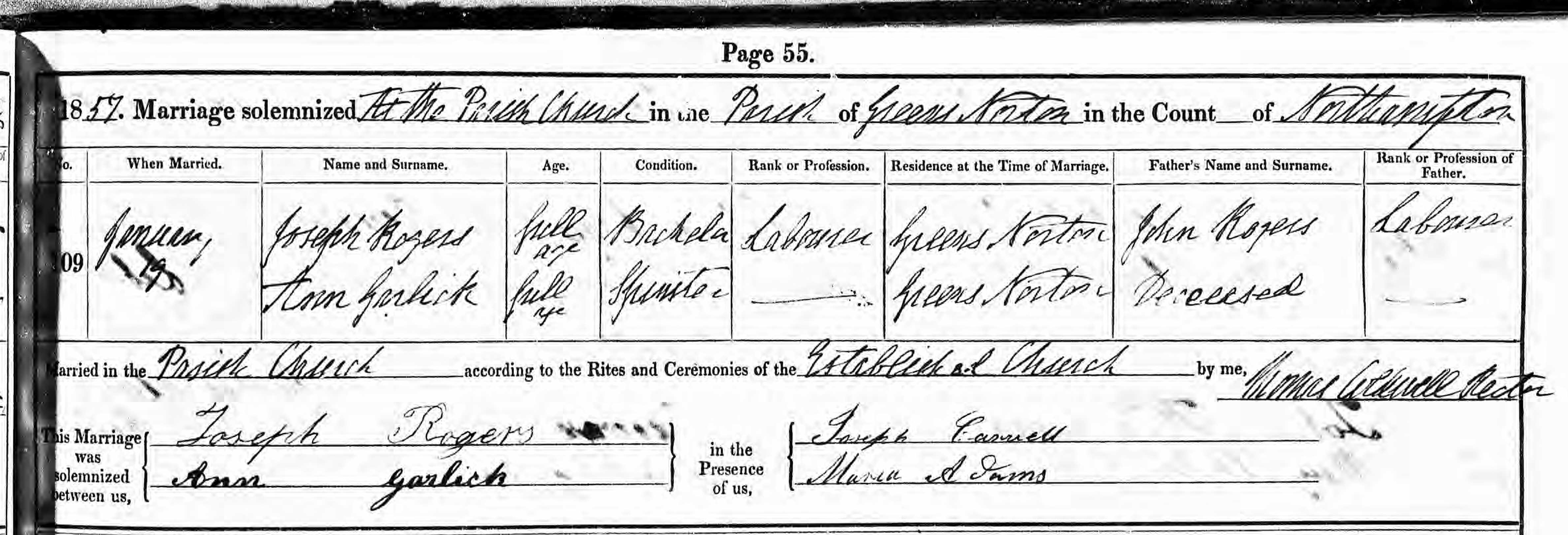 Parish Registers of St Bartholomew, Greens Norton, Northamptonshire; Marriage entry for Joseph Rogers and Ann Garlick, 19 Jan 1857, Page 55, No 109.