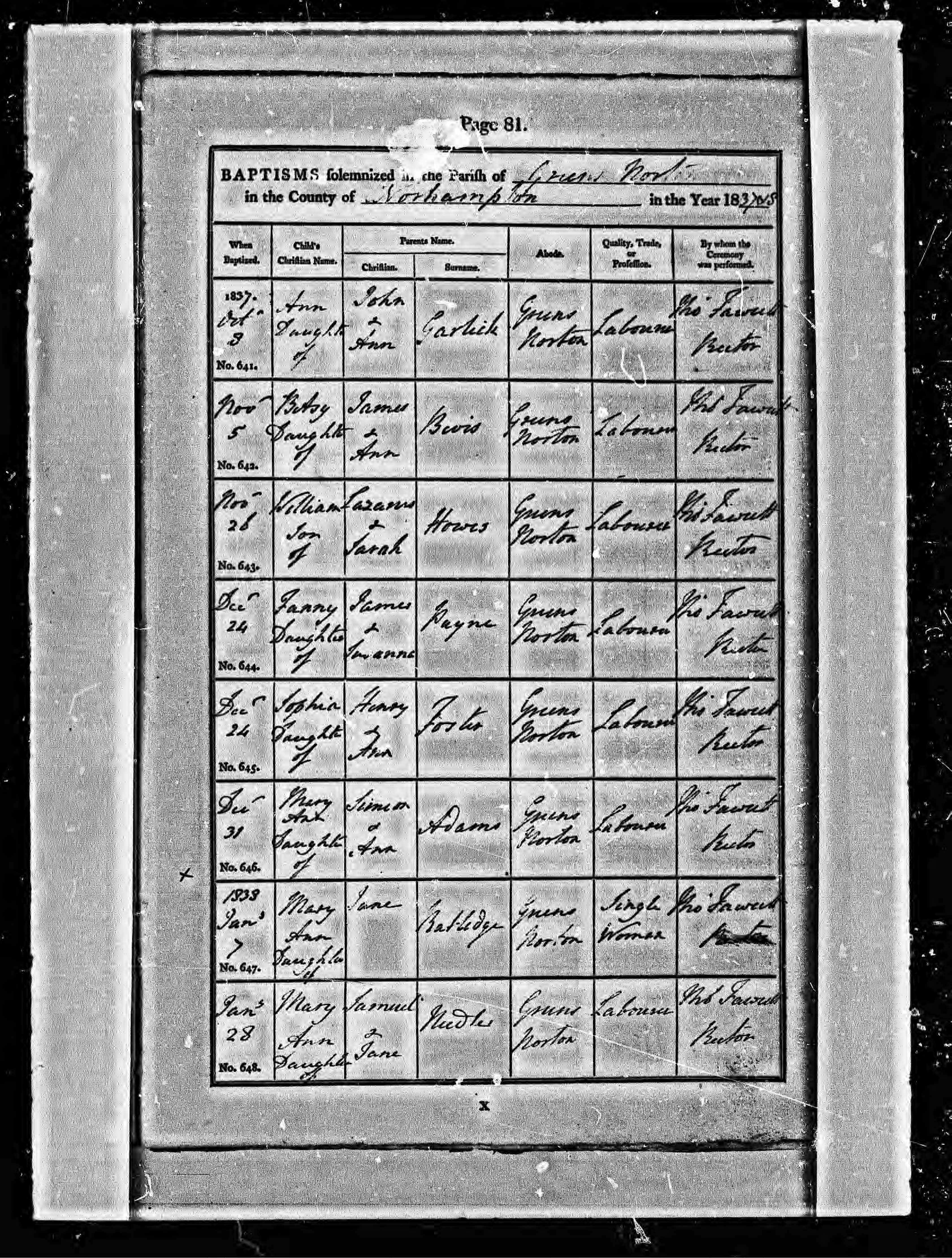 Parish Registers of St Bartholomew, Greens Norton, Northamptonshire; Baptism entry for Ann Garlick, 3 Oct 1837, Page 81, No 641.