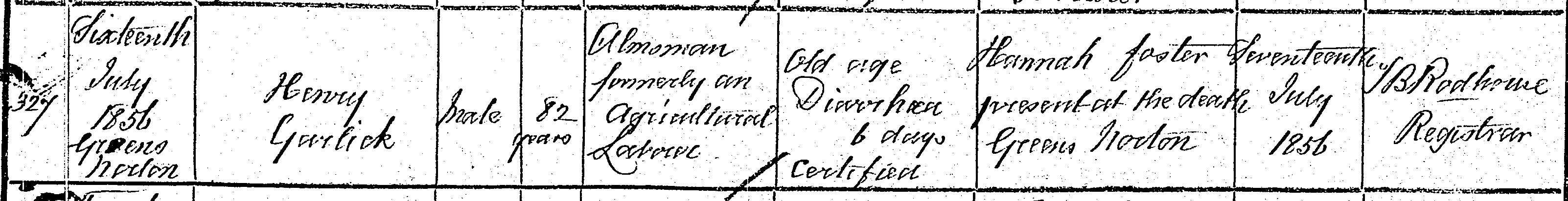 Death in the Registration District of Towcester, Northamptonshire, 1856, no. 327. Died 16 Jul 1856 at Greens Norton; Henry Garlick; Male; age 82; Almsman formerly an Agricultural Labourer. Cause of death: Old age. Diarrhea 6 days. Certified. Informant was Hannah Foster (signed name); relation: Not known; residing at Greens Norton; present at death. The death was registered 17 Jul 1856.