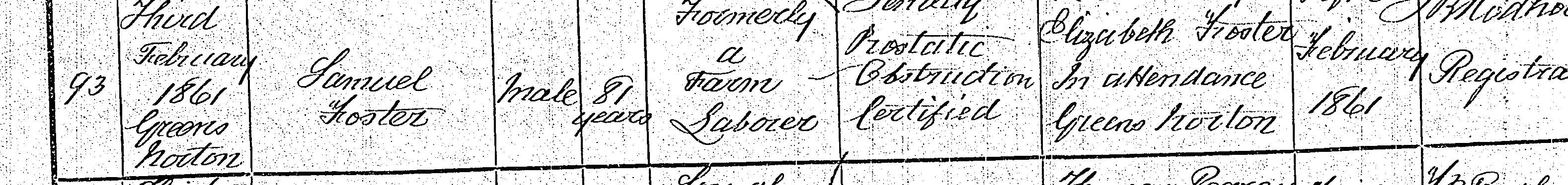 Death in the Registration District of Towcester, Northamptonshire, 1861, no. 93. Died 3 Feb 1861 at Greens Norton; Samuel Foster; Male; age 81; Formerly a Farm Labourer. Cause of death: [S--a--y] Prostatic Obstruction, Certified. Informant was Elizabeth Foster; relation: Not known; residing at Greens Norton; present at death. The death was registered 4 Feb 1861. Day of month not visible for registration date