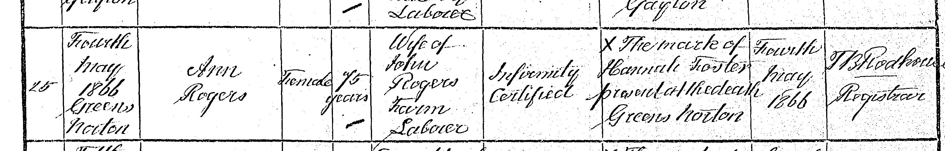 Death in the Registration District of Towcester, Northamptonshire, 1866, no. 25. Died 4 May 1866 at Greens Norton; Ann Rogers; Female; age 75; Wife of John Rogers, Farm Labourer. Cause of death: Infirmity. Certified. Informant was Hannah Foster (could not sign name); relation: Not known; residing at Greens Norton; present at death. The death was registered 4 May 1866.