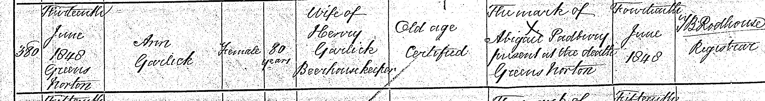 Death in the Registration District of Towcester, Northamptonshire, 1848, no. 380. Died 13 Jun 1848 at Greens Norton; Ann Garlick; Female; age 80; Wife of Henry Garlick, Beehouse Keeper. Cause of death: Old age, certified. Informant was Abigale Padbury (could not sign name); relation: Not known; residing at Greens Norton; present at death. The death was registered 14 Jun 1848. Ann Garlick