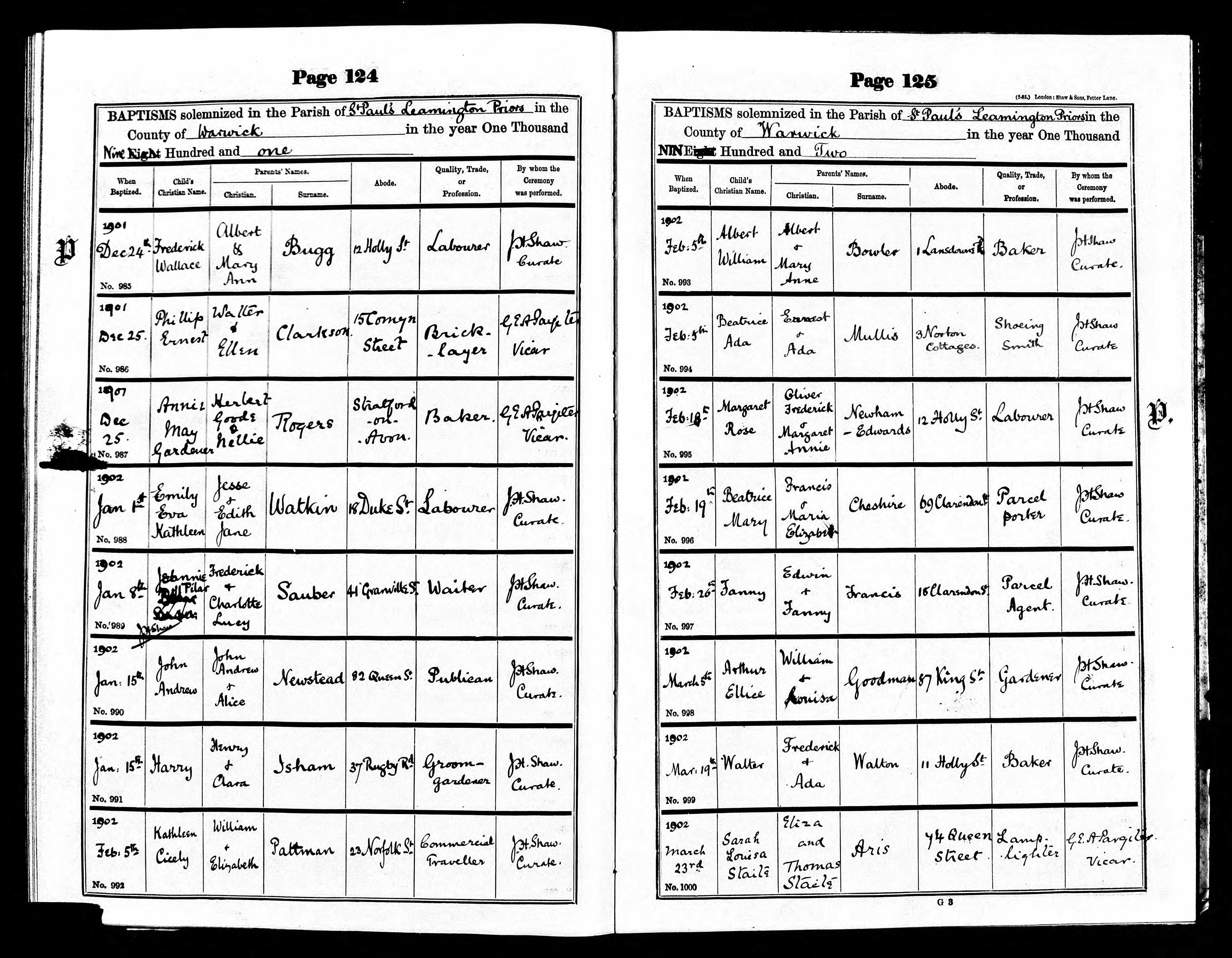 Cited from Parish Registers of St. Paul, Leamington Priors, Warwickshire (Church of England)