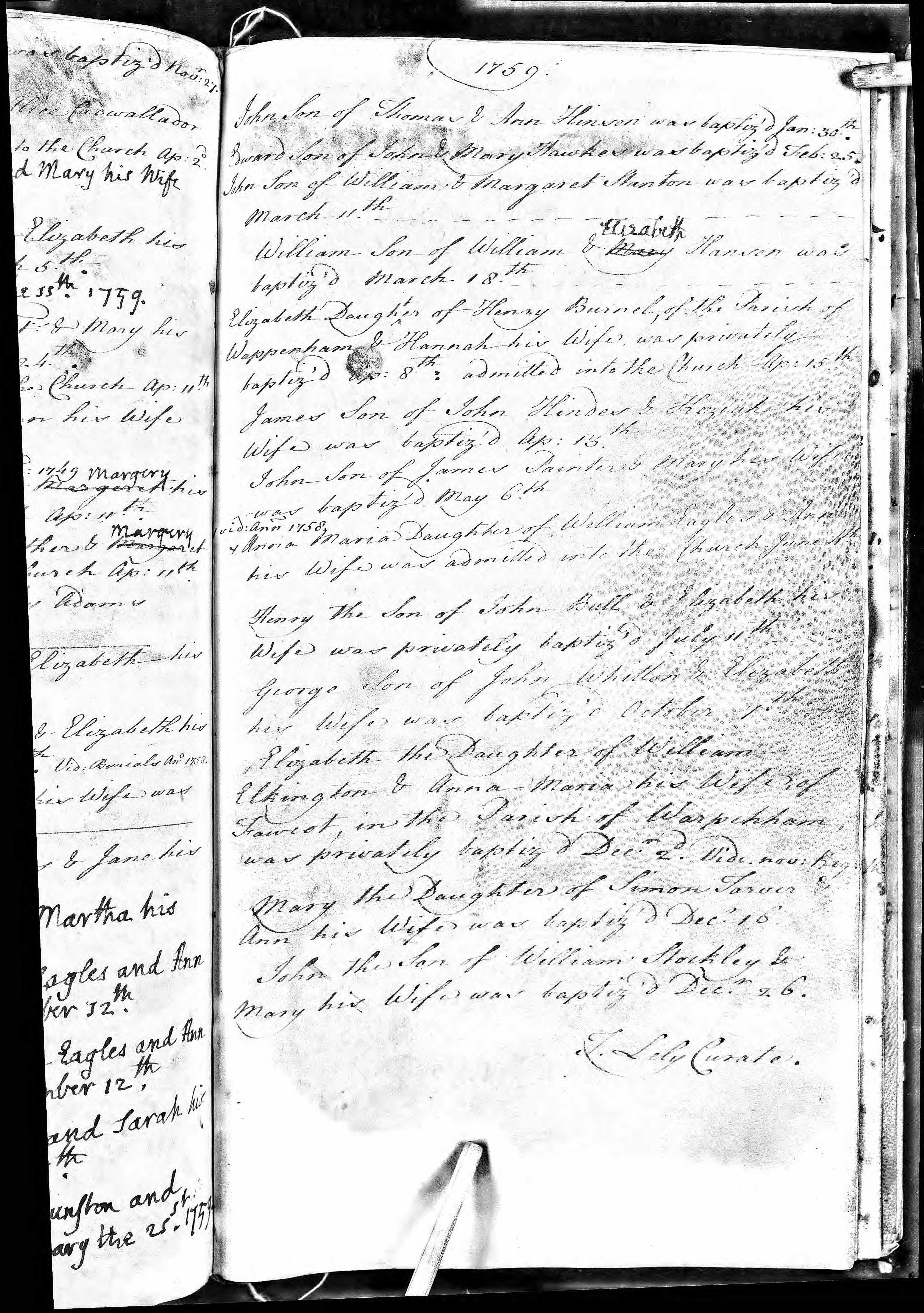 Parish Registers of St. Mary Magdalene, Helmdon, Northamptonshire; Baptism entry for John Hinson, 30 Jan 1759.