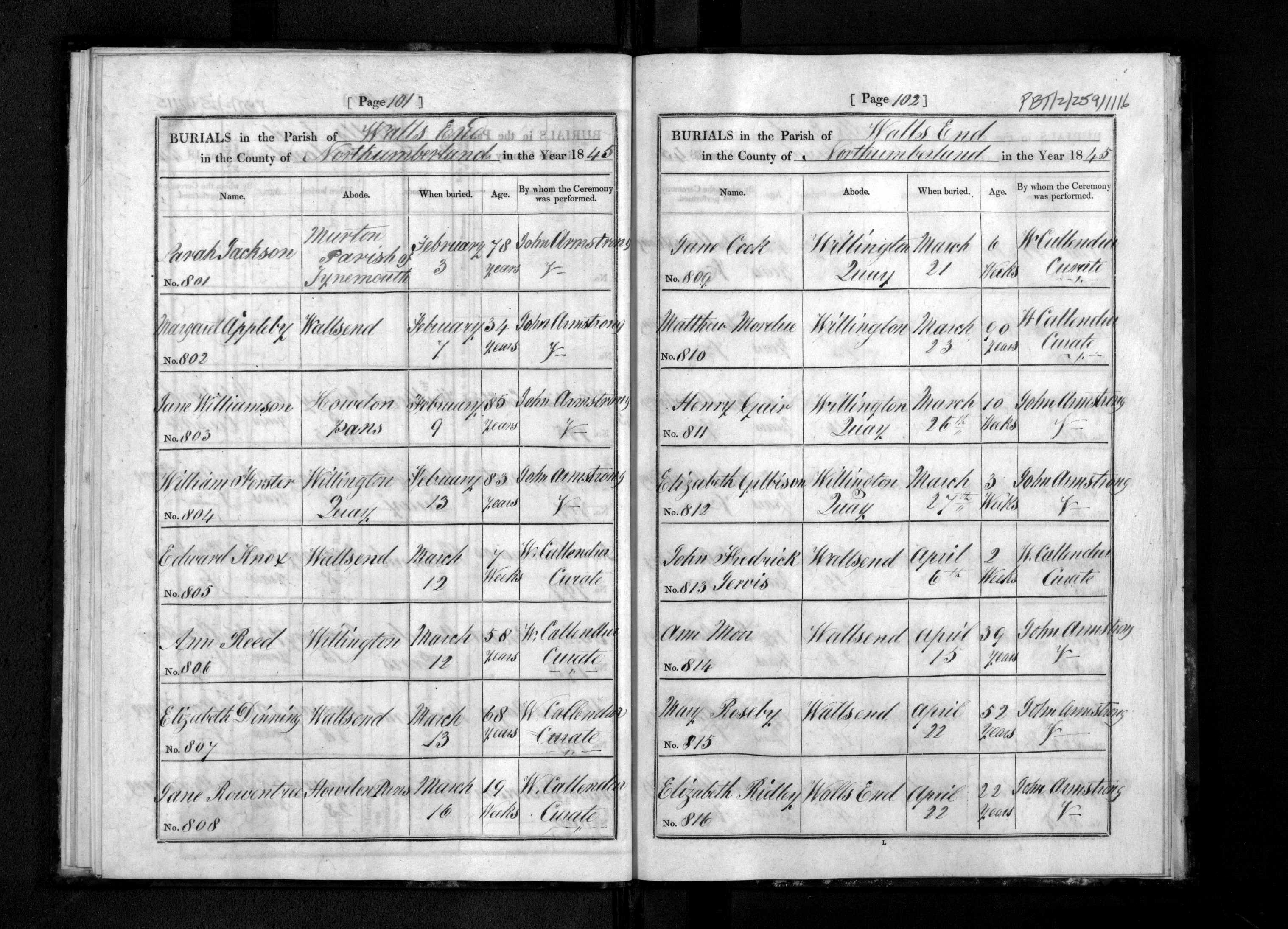 Bishop's Transcripts for the Diocese of Durham, England; Burial entry for Matthew Mordue, Wallsend, 23 Mar 1845, Page 102, No 810.