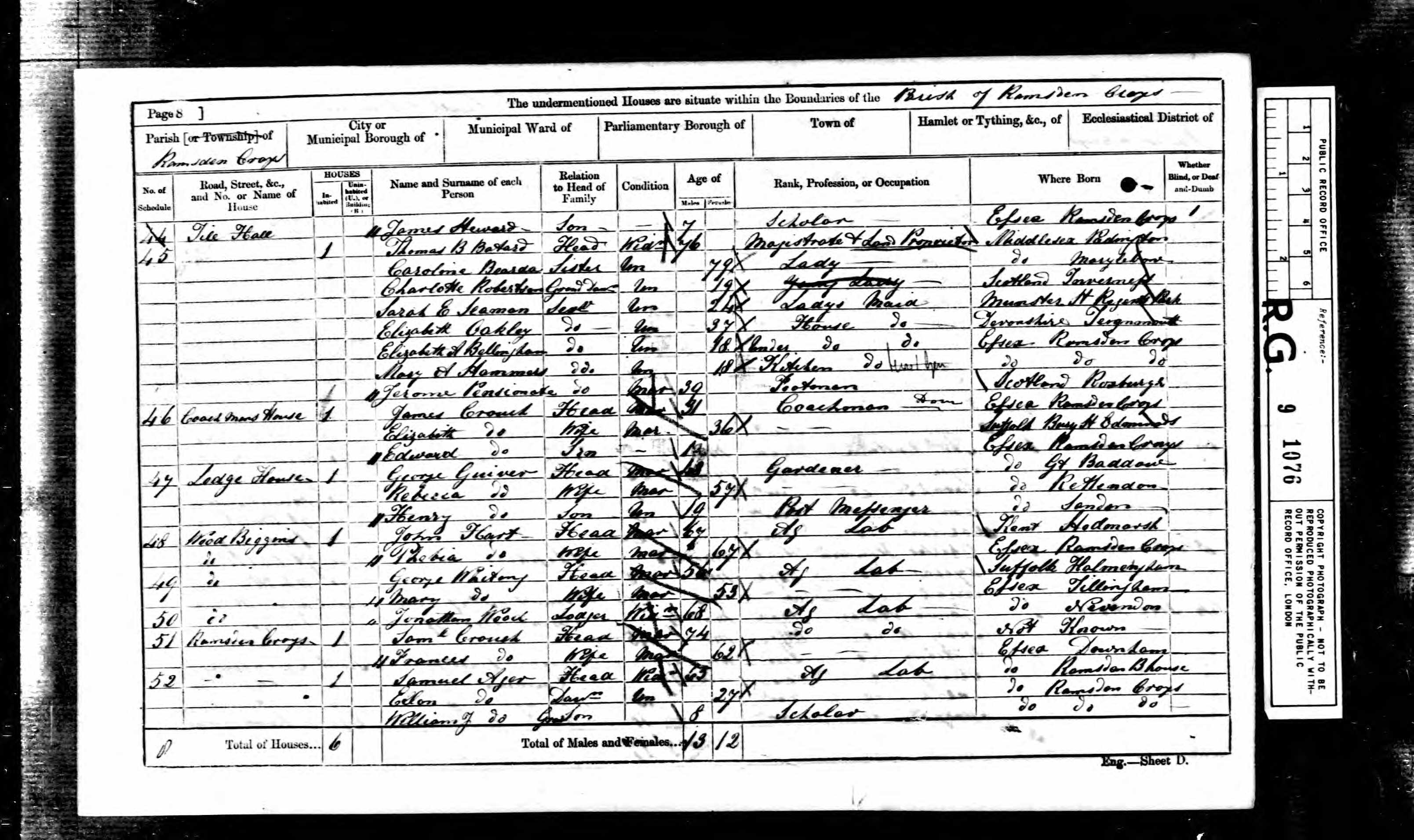 - was recorded in the census on 7 Apr, 1861 at Lodge House, Ramsden Crays, Essex, England