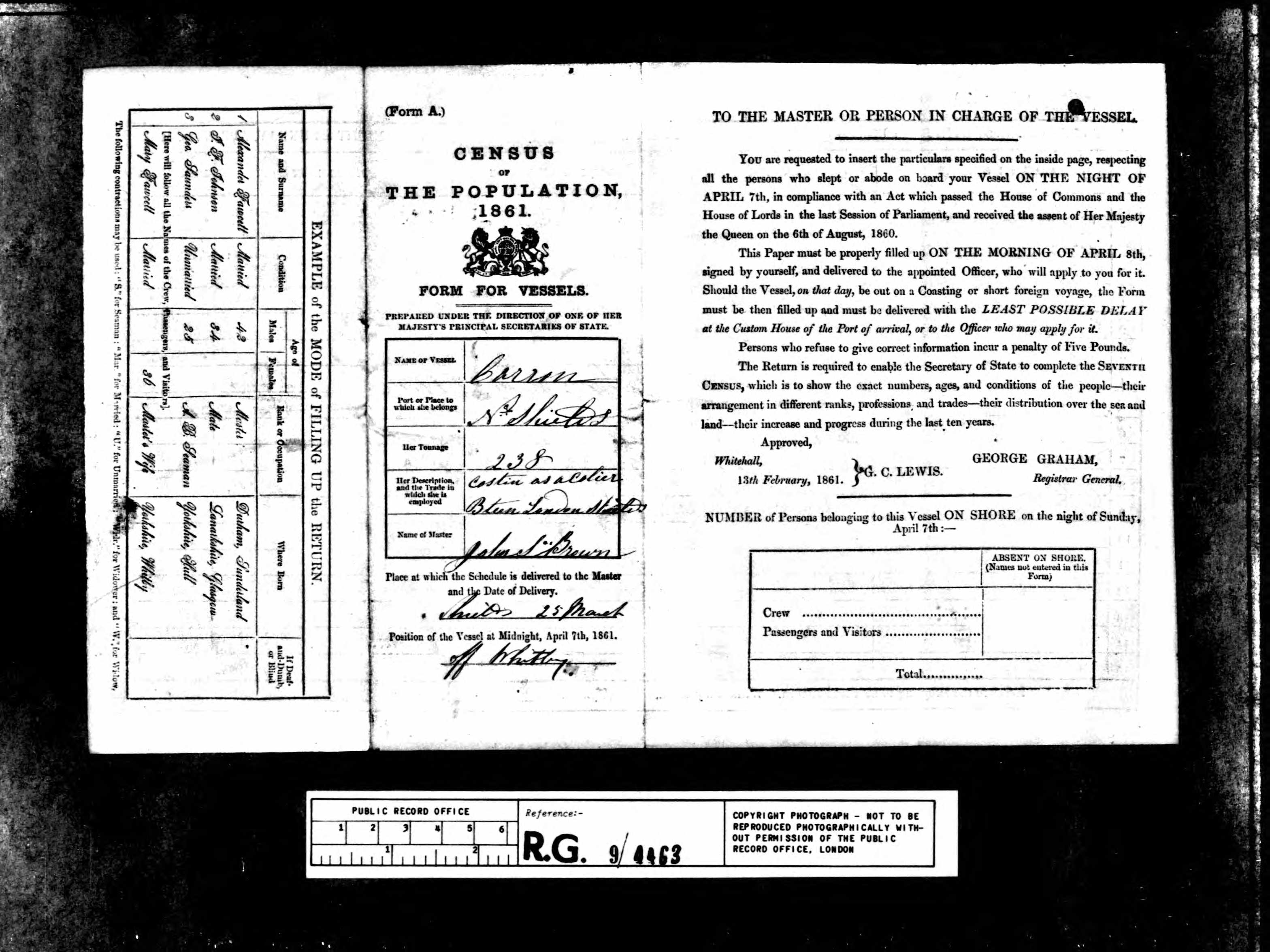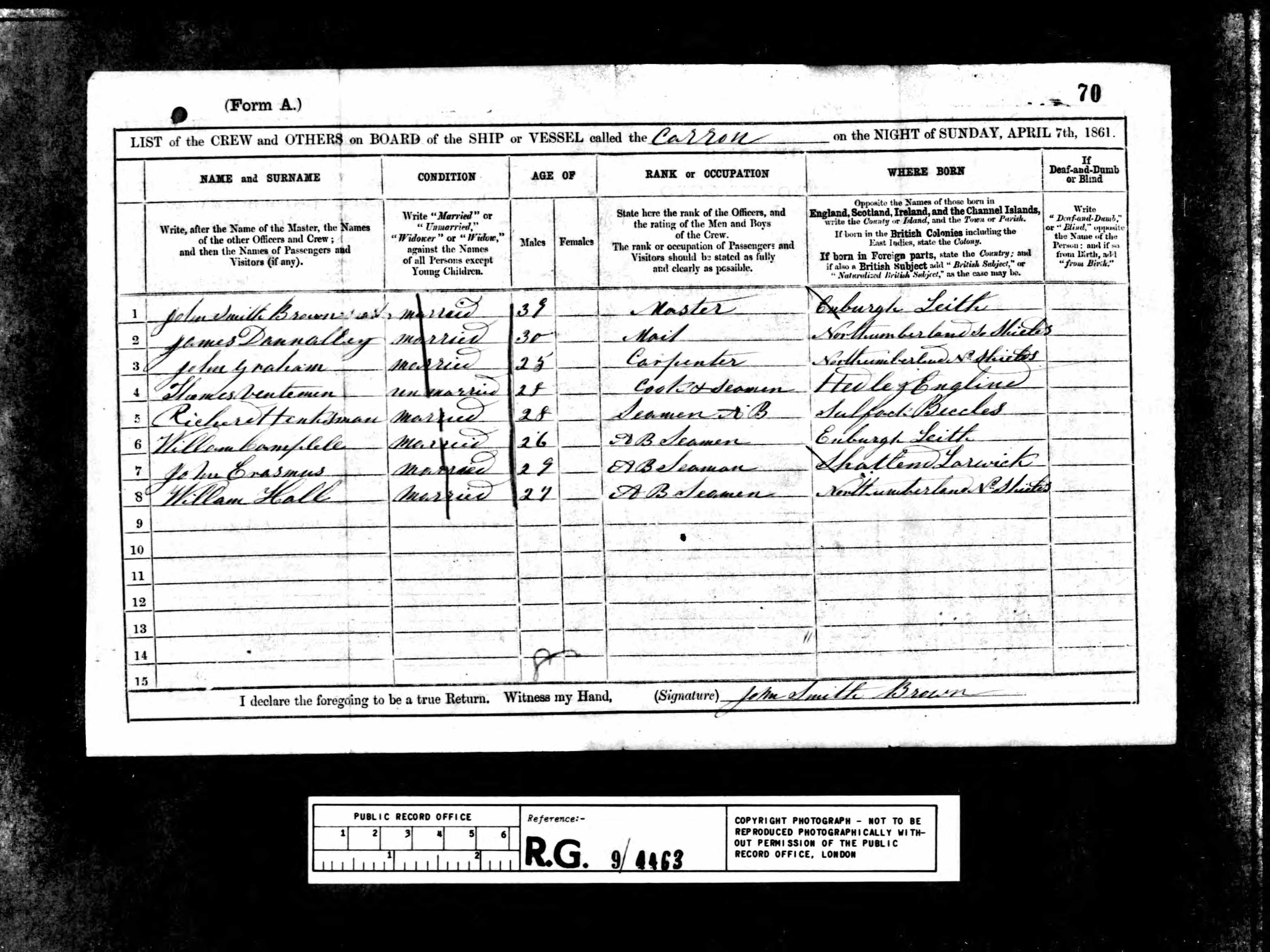 - was recorded in the census on 7 Apr, 1861 aboard the Carron