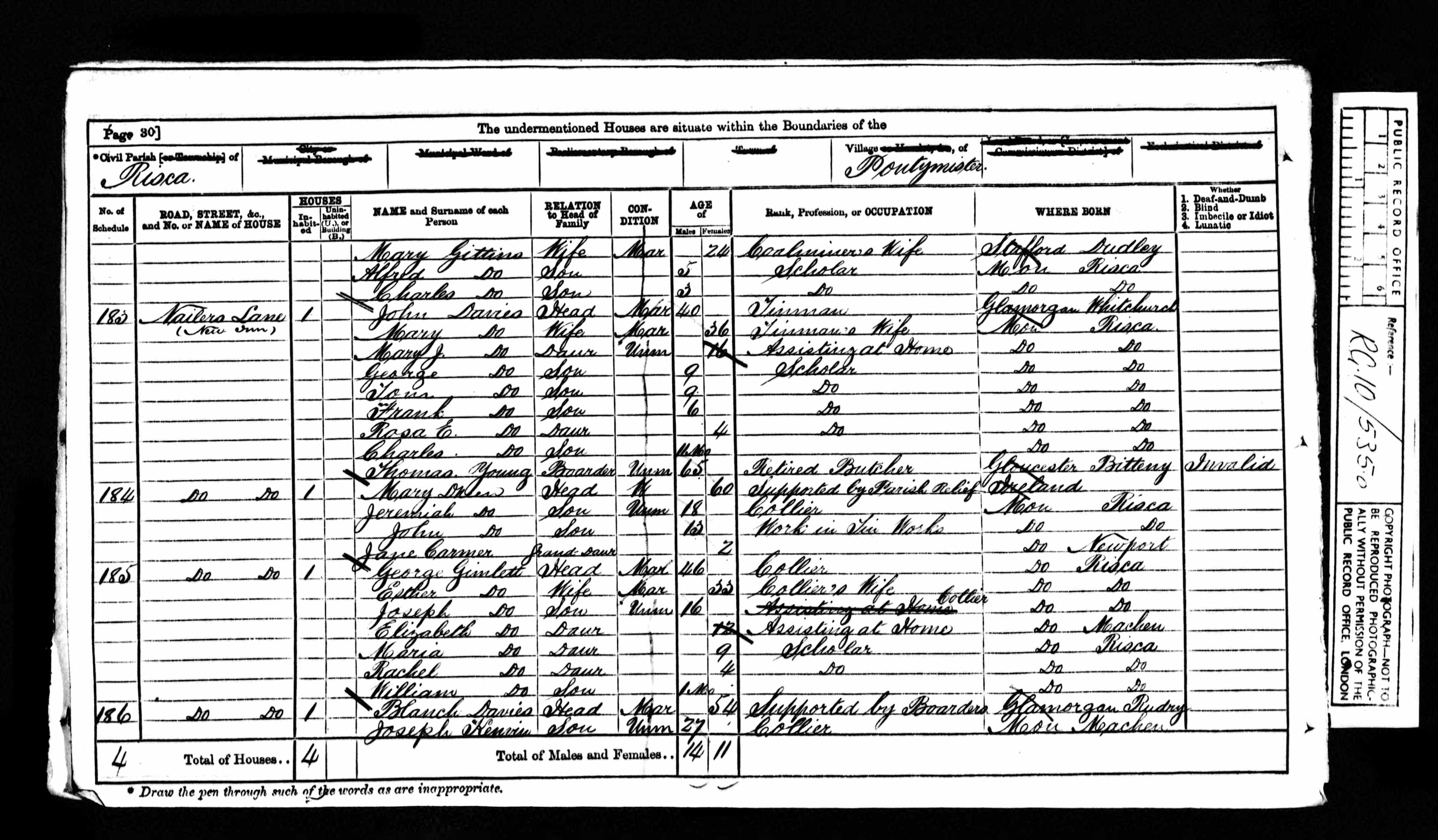 - was recorded in the census on 2 Apr, 1871 at Nailers Lane, Risca, Monmouthshire, Wales