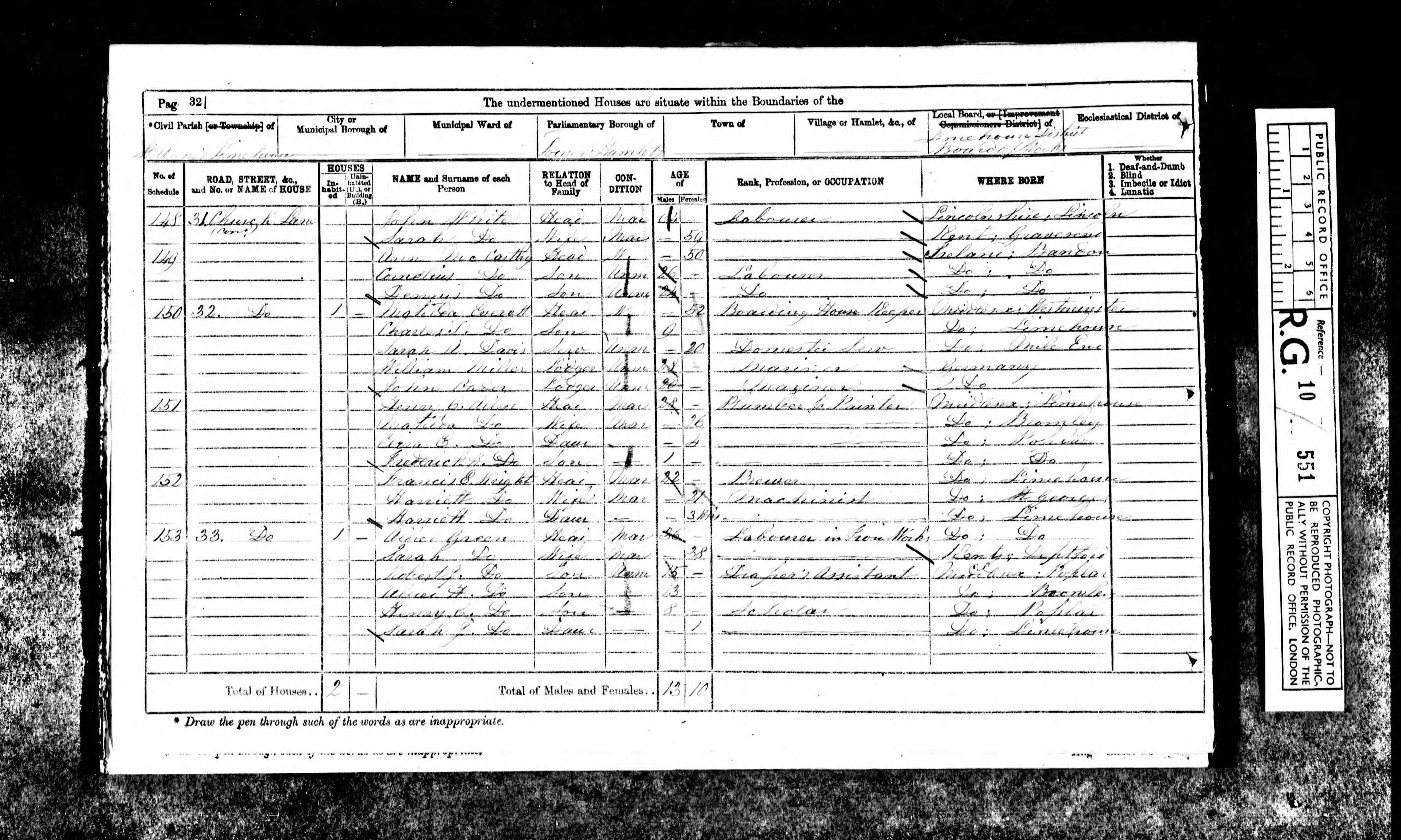 1871 England and Wales Census; Class RG10, Piece 551, Folio 19, Page 32, Schedule 153.