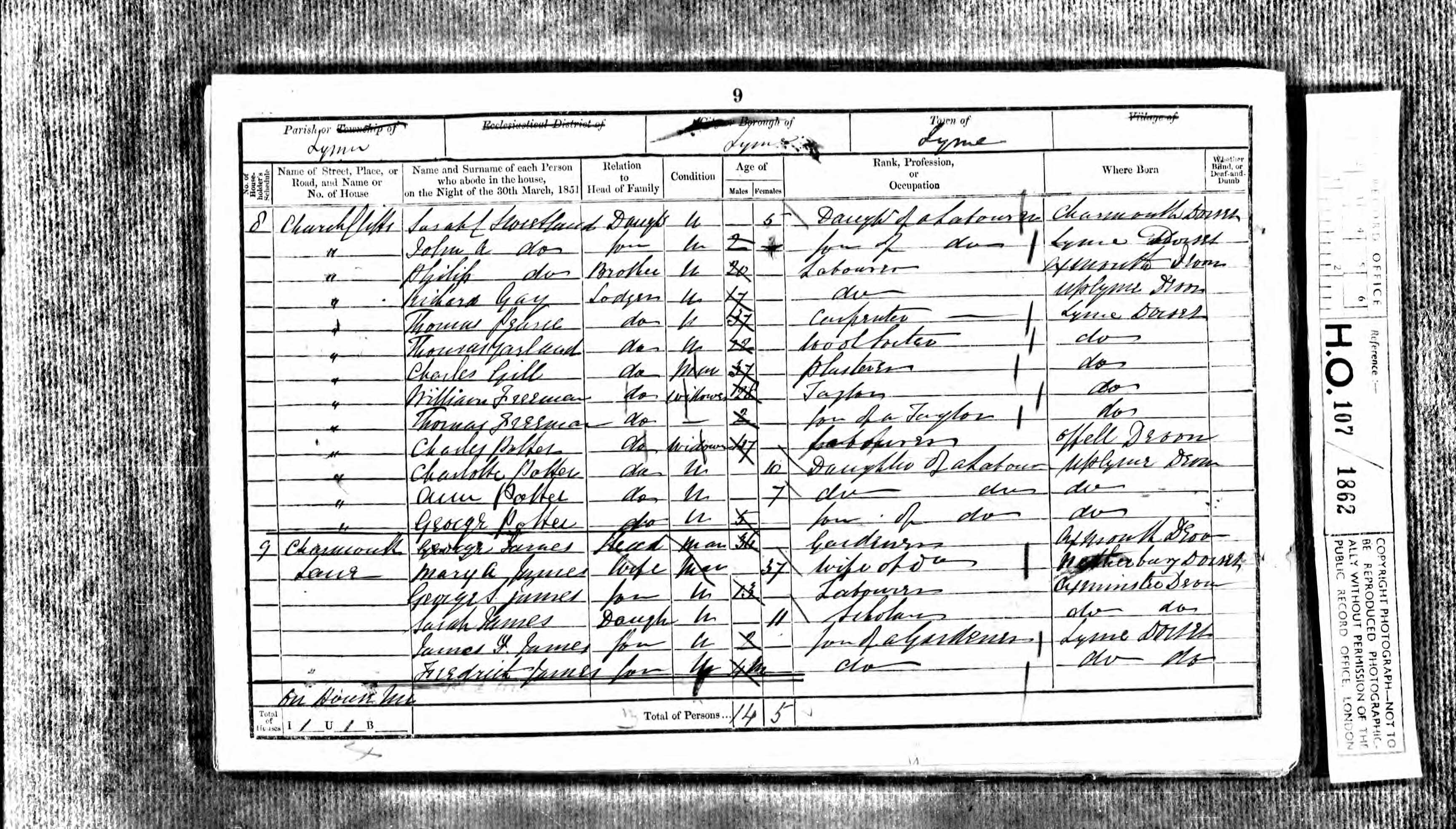 - was recorded in the census on 30 Mar, 1851 at Church Cliffs, Lyme Regis, Dorset, England