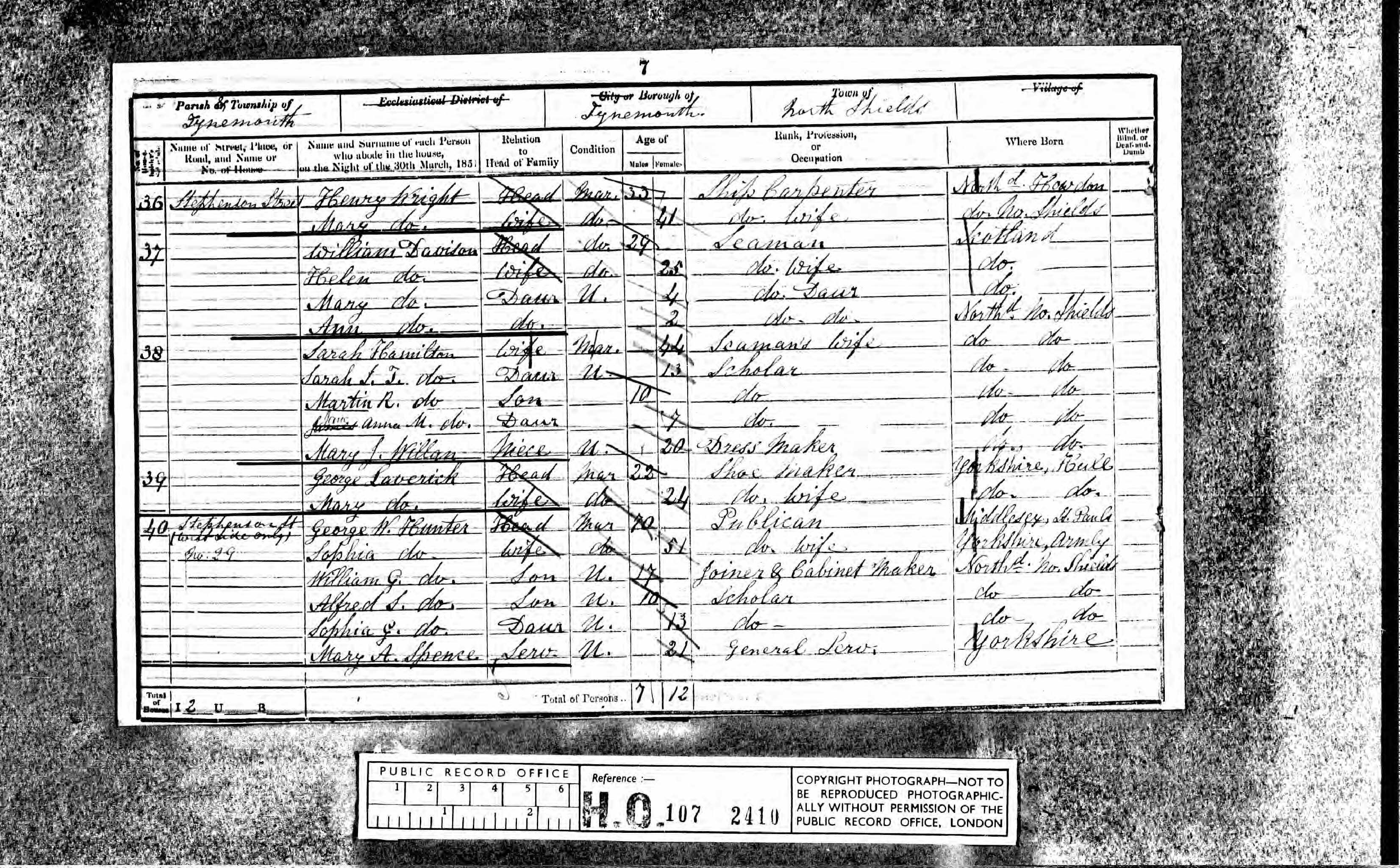 - was recorded in the census on 30 Mar, 1851 at Stephenson Street, Tynemouth, Northumberland, England