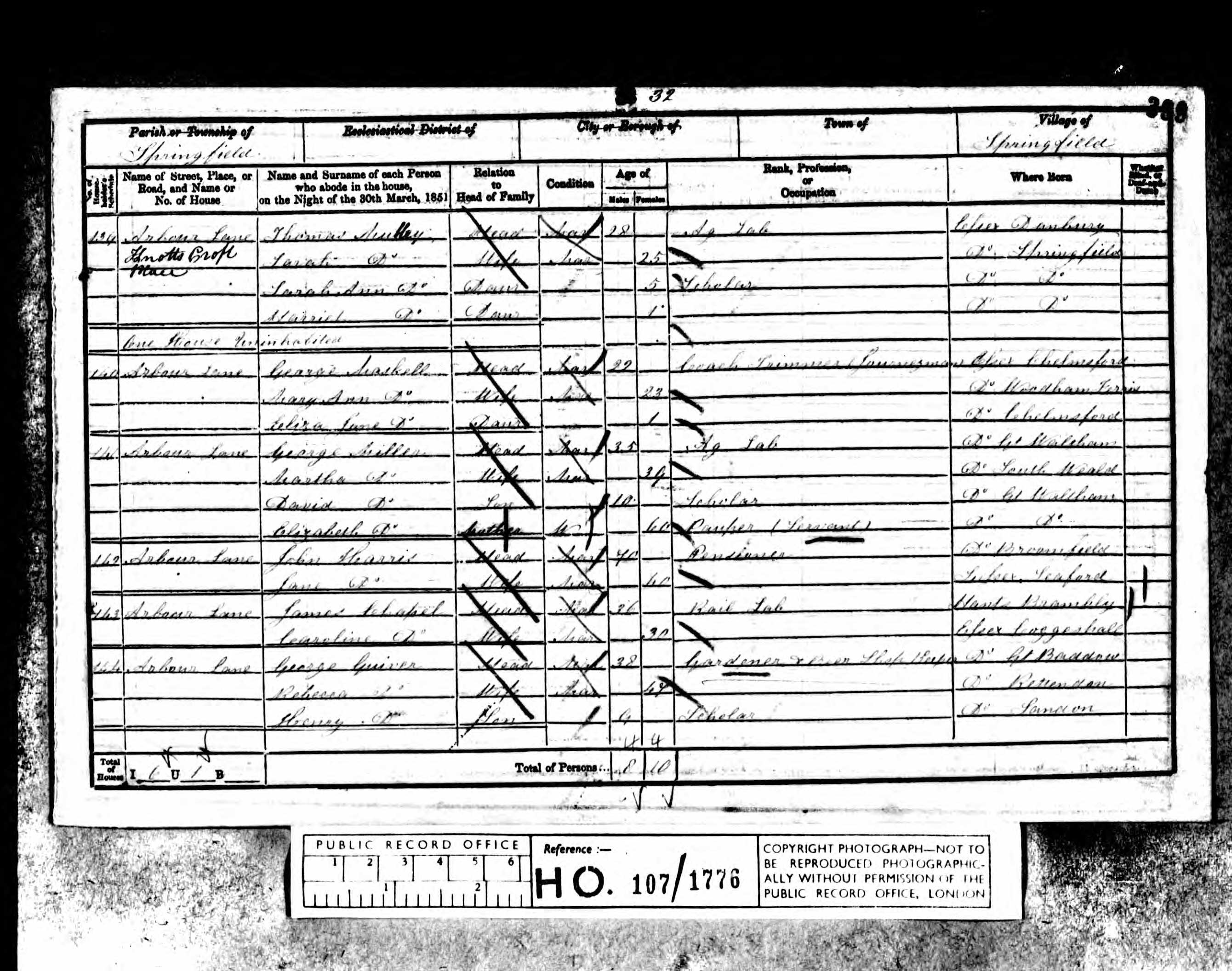 1851 England and Wales Census; Class HO107, Piece 1776, Folio 398, Page 32, Schedule 144.