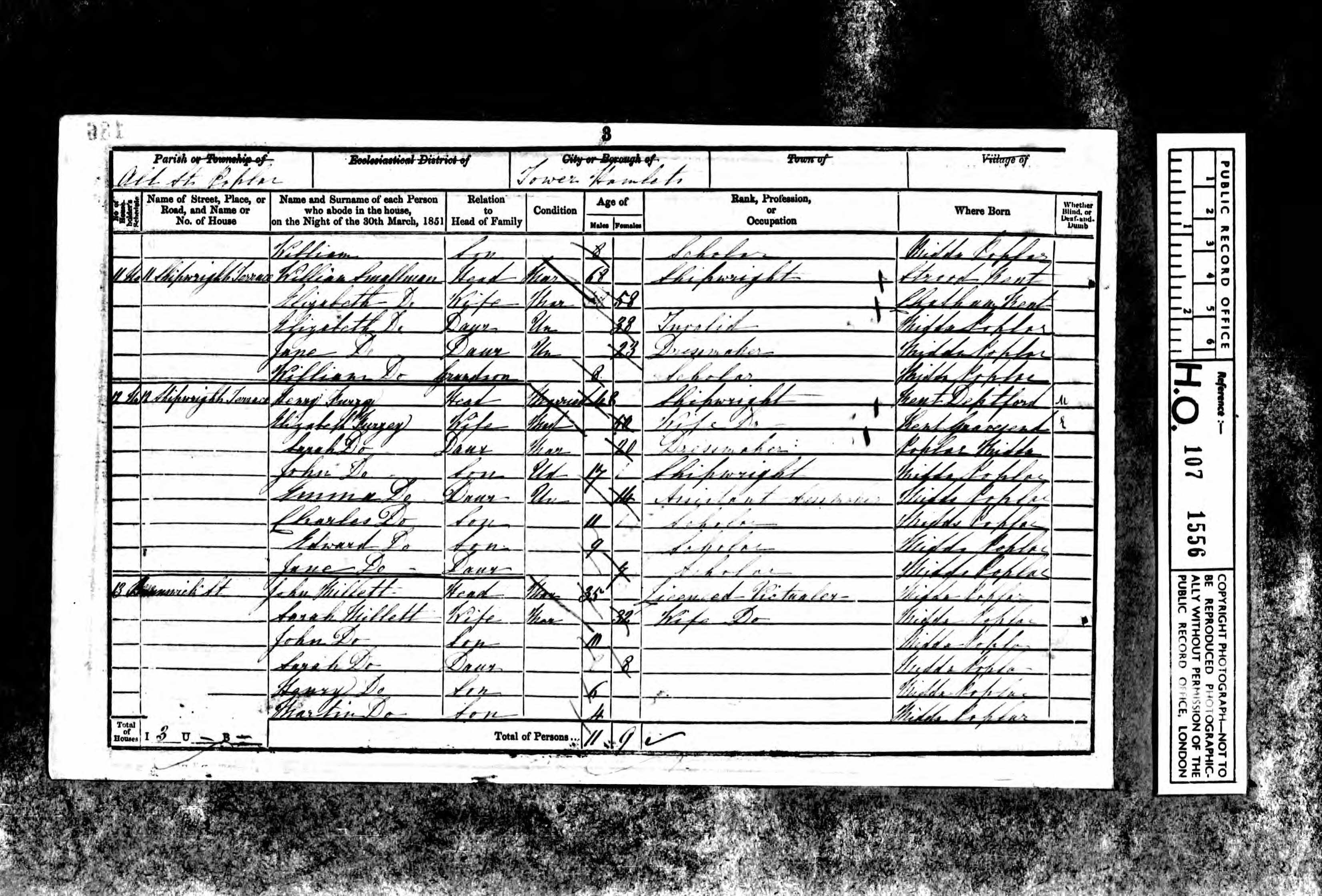 - was recorded in the census on 30 Mar, 1851 at 12 Shipwrights Terrace, Blackwall, Middlesex, England