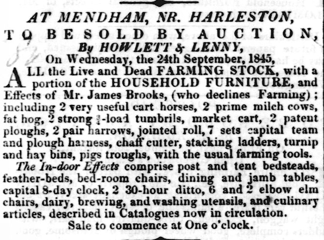 ALL the Live and Dead FARMING STOCK, with a portion of the HOUSEHOLD FURNITURE and Effects of Mr. James Brooks, (who declines Farming) ; including 2 very useful cart horses, 2 prime milch cows, fat hog, 2 strong 3/4-load tumbrils, market cart, 2 patent ploughs, 2 pair harrows, jointed roll, 7 sets capital team and plough harness, chaff cutter, stacking ladders, turnip and hey bins, pigs troughs, with the usual farming tools. The In-door Effects comprise post and tent bedsteads, feather-beds, bed-room chairs, dining and jamb tables, capital 8-day clock, 2, 30-hour ditto, 6 and 2 elbow elm chairs, dairy, brewing, and washing utensils, and culinary articles, described in Catalogues now in circulation.