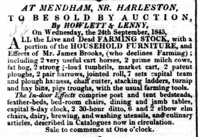 The Suffolk Chronicle, No 1847, 20 Sep 1845, Page 2, Col 1, At Mendham, James Brooks (Download this image)