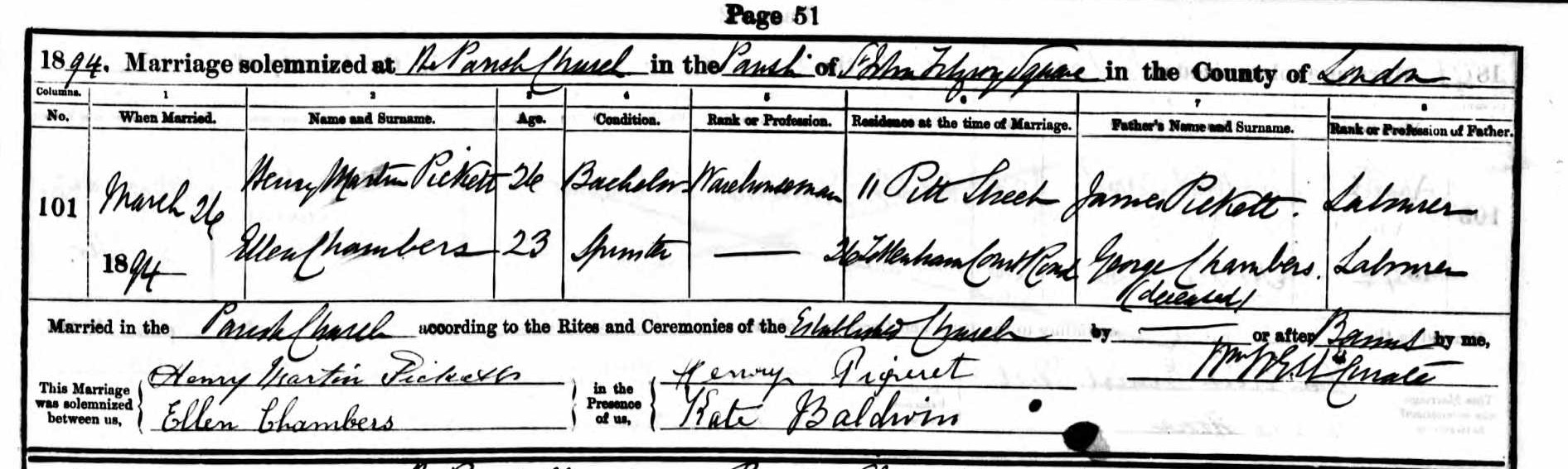 Henry Martin Pickett, 26, Bachelor, occupation Warehouseman, abode 11 Pitt Street and Ellen Chambers, 23, Spinster, abode 26 Tottenham Court Road. Married by Banns. Groom's father: James Pickett, occupation Labourer. Bride's father: George Chambers (deceased), occupation Labourer. Groom signed name. Bride signed name. Witness: Henry Piquet (signed). Witness: Kate Baldwin (signed).