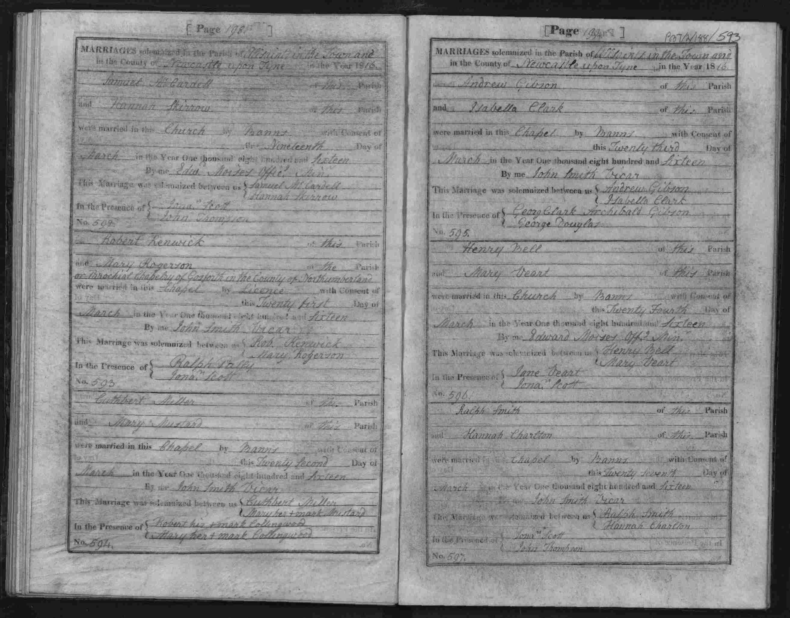 Bishop's Transcripts for the Diocese of Durham, England; Marriage entry for Cuthbert Miller and Mary Mustard, Newcastle All Saints, 22 Mar 1816, Page 198, No 594.