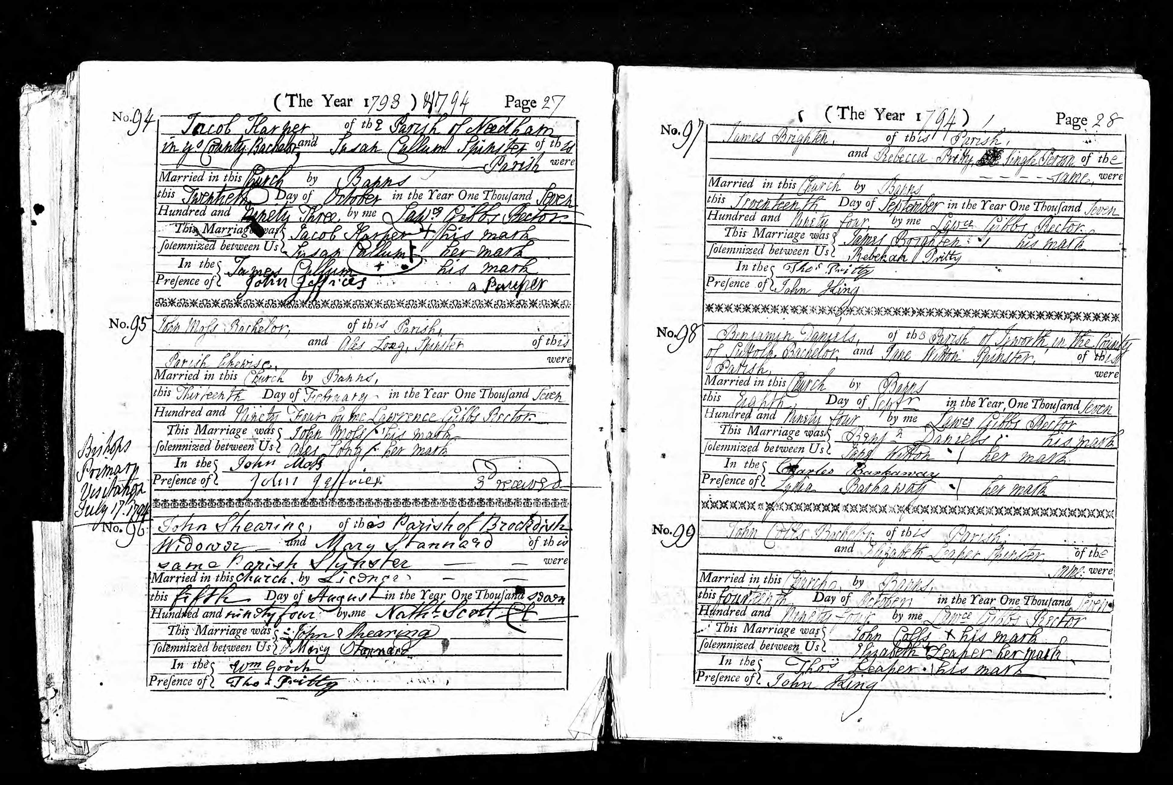 Parish Registers of St Peter & St Paul, Brockdish, Norfolk; Marriage entry for James Brighten and Rebecca Pritty, 17 Sep 1794, Page 28, No 97.