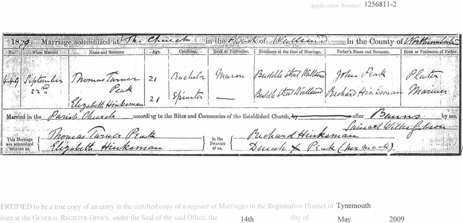 Marriage at The Parish Church in the Registration District of Tynemouth, district of Parish of Wallsend, Northumberland, 1879, no. 449. Married 22 Sep 1879; Thomas Turner Peak, age 21, condition Bachelor, occupation Mason, residence Buddle Street, Wallsend and Elizabeth Hinksman, age 21, condition Spinster, residence Buddle Street, Wallsend; groom's father John Peak, Plater; bride's father Richard Hinksman, Mariner; married by Banns according to the rites of the Established Church; groom signed name, bride signed name; witnesses Richard Hinksman (signed), Dinah Peak (did not sign)