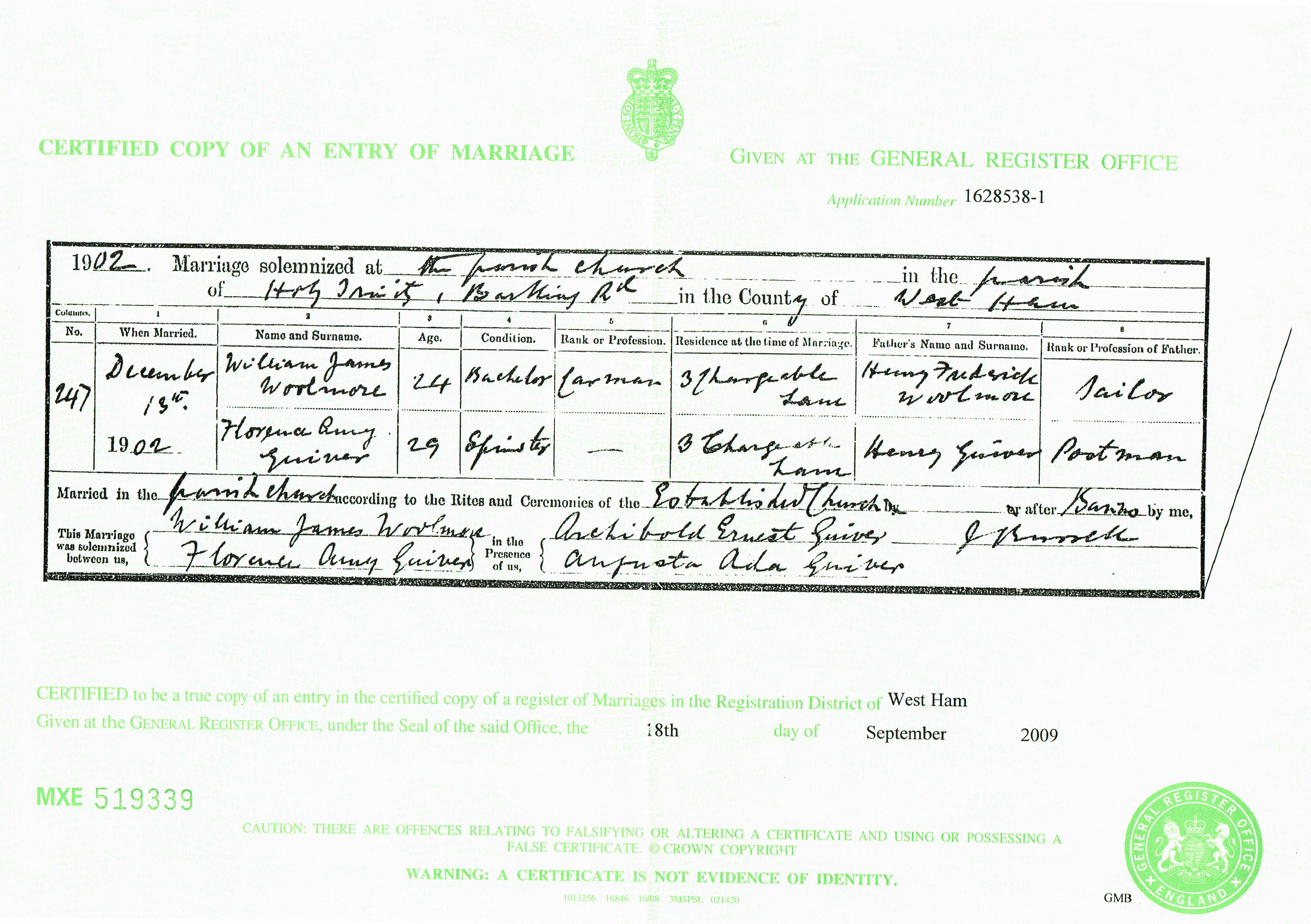 General Register Office of England and Wales; Marriage entry for William James Woolmore and Florence Amy Guiver, West Ham, Oct-Dec Qtr 1902, Vol 4A, Page 18, No 247; Certified copy obtained 18 Sep 2009.