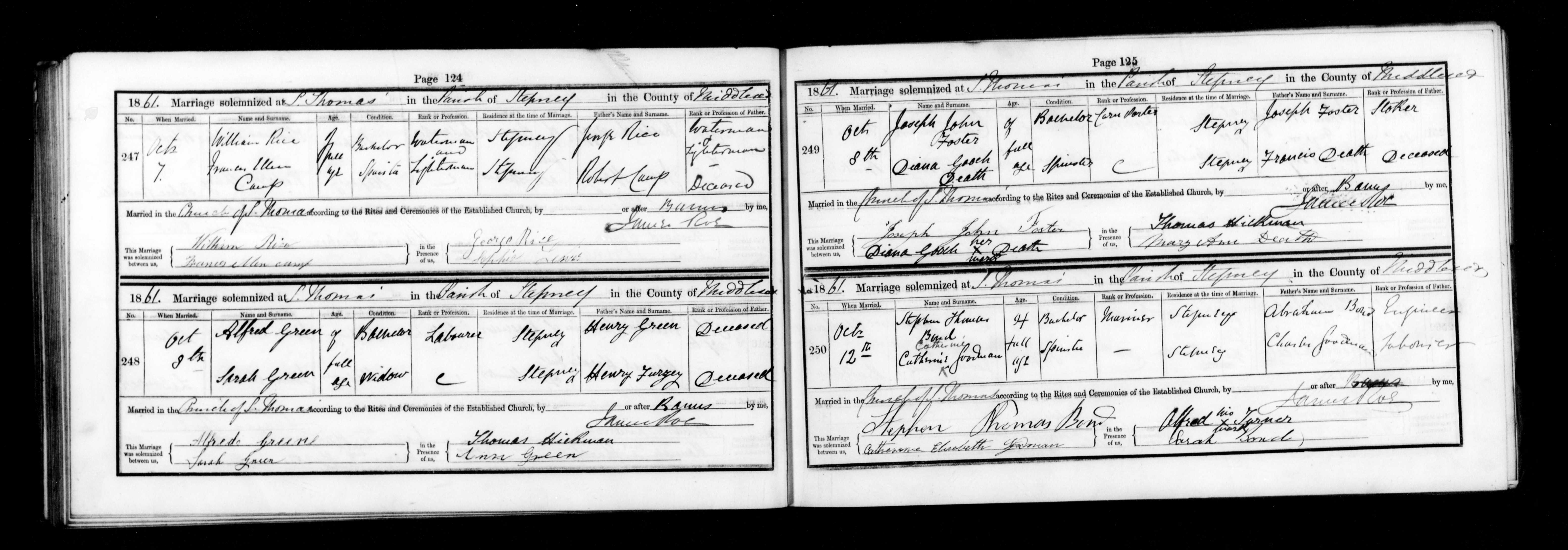 Parish Registers of St. Thomas, Stepney, Middlesex; Marriage entry for Alfred Green and Sarah Green, 8 Oct 1861, Page 124, No 248.