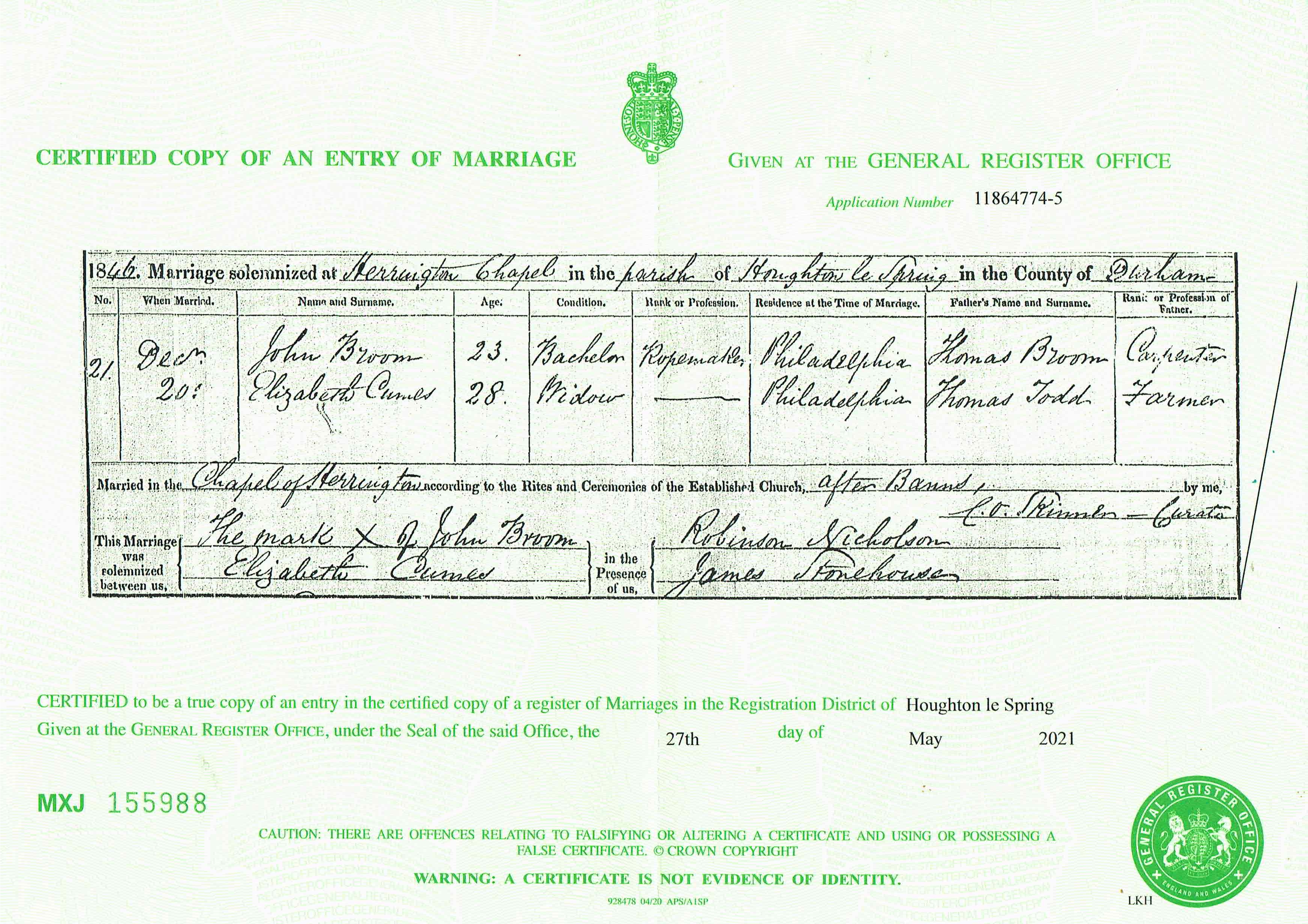 General Register Office of England and Wales; Marriage entry for James Todd and Mary Patherick, Sunderland, Jul-Sep Qtr 1851, Vol 24, Page 189, No 261; Certified copy obtained 27 May 2021.