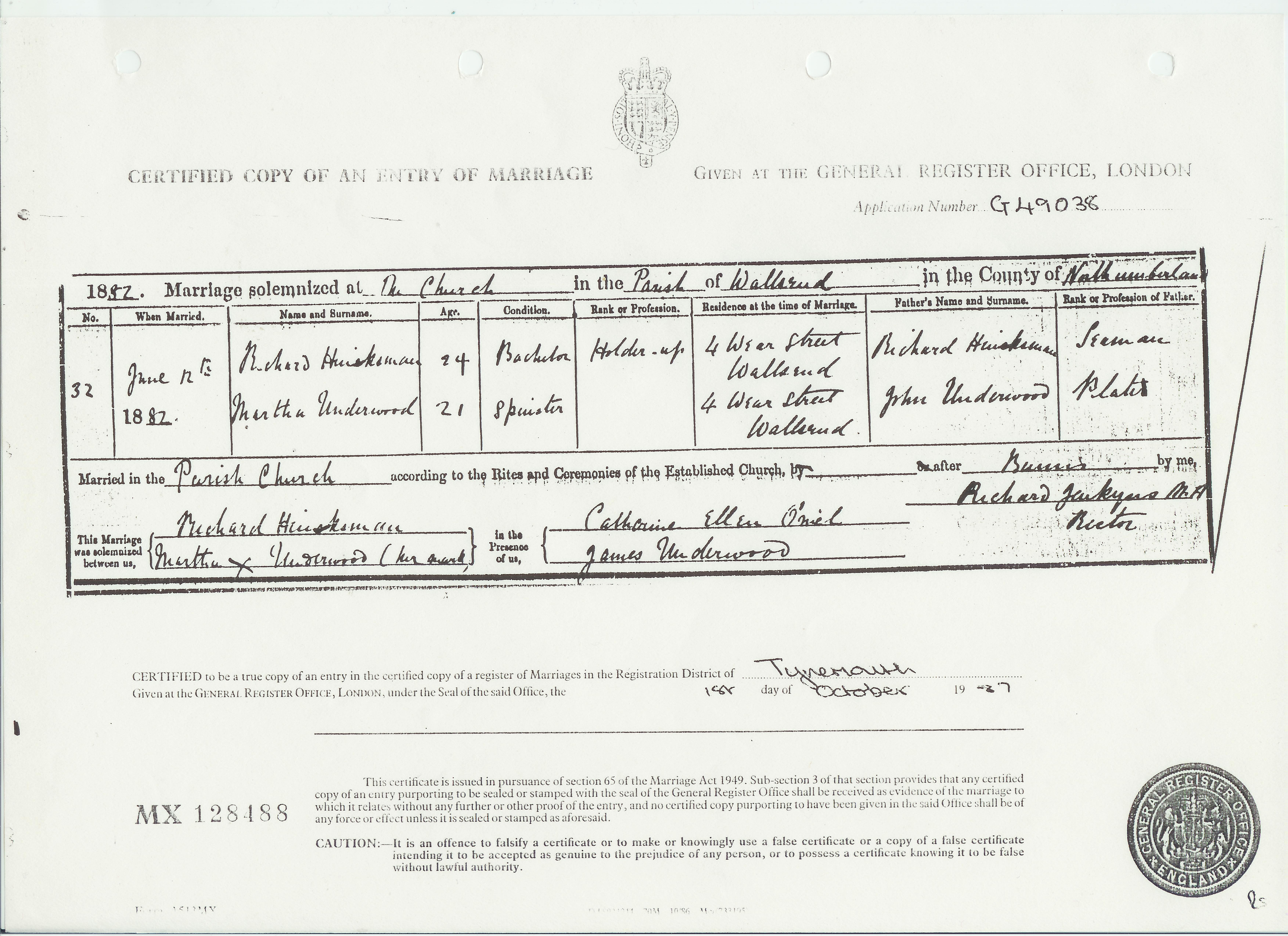Marriage at The Parish Church in the Registration District of Tynemouth, district of Wallsend, Northumberland, 1882, no. 32. Married 12 Jun 1882; Richard Hinksman, age 24, condition Bachelor, occupation Holder-up, residence 4 Wear Street, Wallsend and Martha Underwood, age 21, condition Spinster, residence 4 Wear Street, Wallsend; groom's father Richard Hinksman, Seaman; bride's father John Underwood, Plater; married by Banns according to the rites of the Established Church; groom signed name, bride could not sign name; witnesses Catherine Ellen O'niel (signed), James Underwood (did not sign)