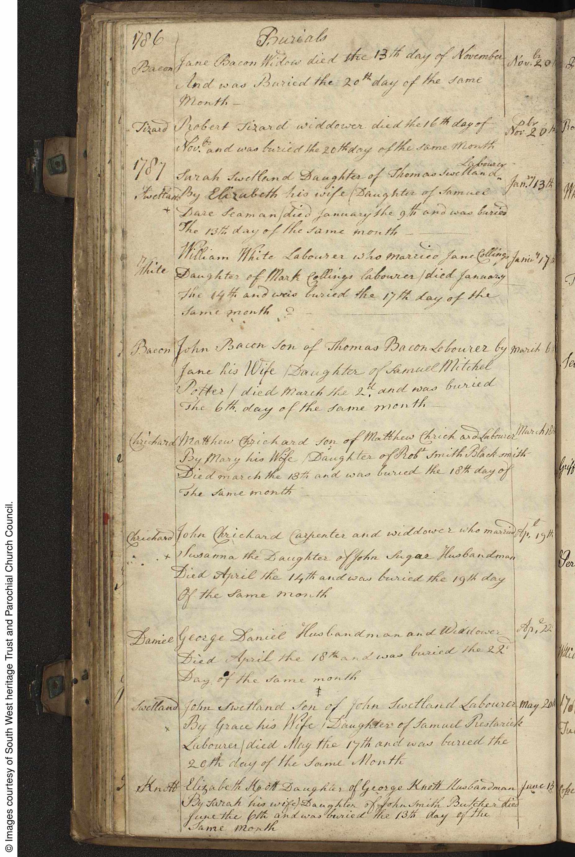 Parish Registers of St. Michael, Axmouth, Devon; Burial entry for Sarah Swetland, 13 Jan 1787.