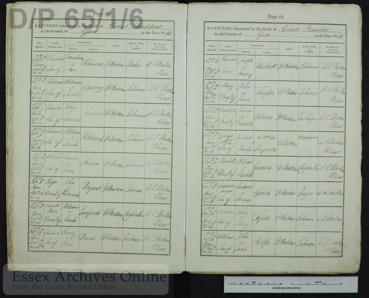 Parish Registers of St. Mary the Virgin, Great Baddow, Essex; Baptism entry for Charles Guiver, 7 Sep 1815, Page 18, No 139.