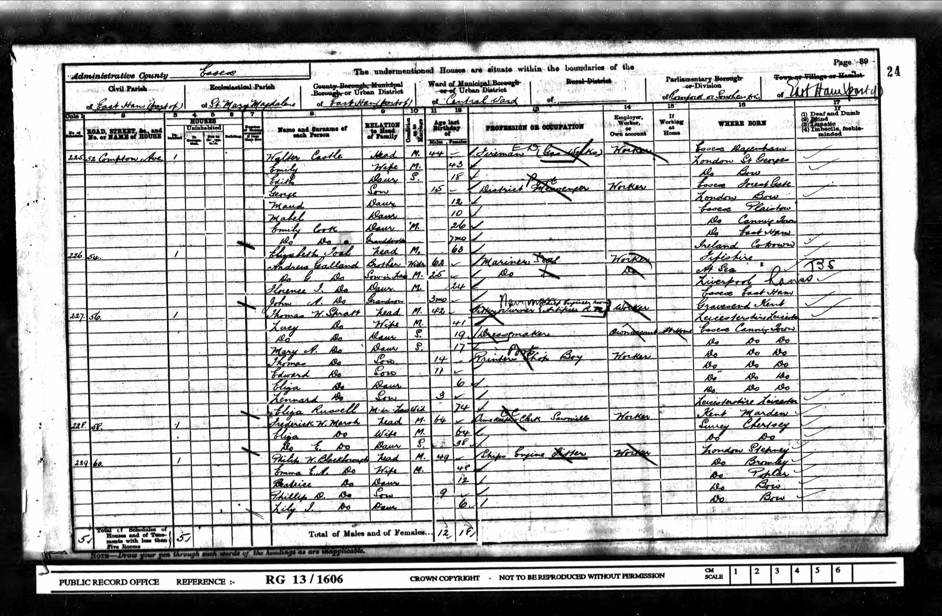1901 England and Wales Census; Class RG13, Piece 1606, Folio 24, Page 39, Schedule 229.