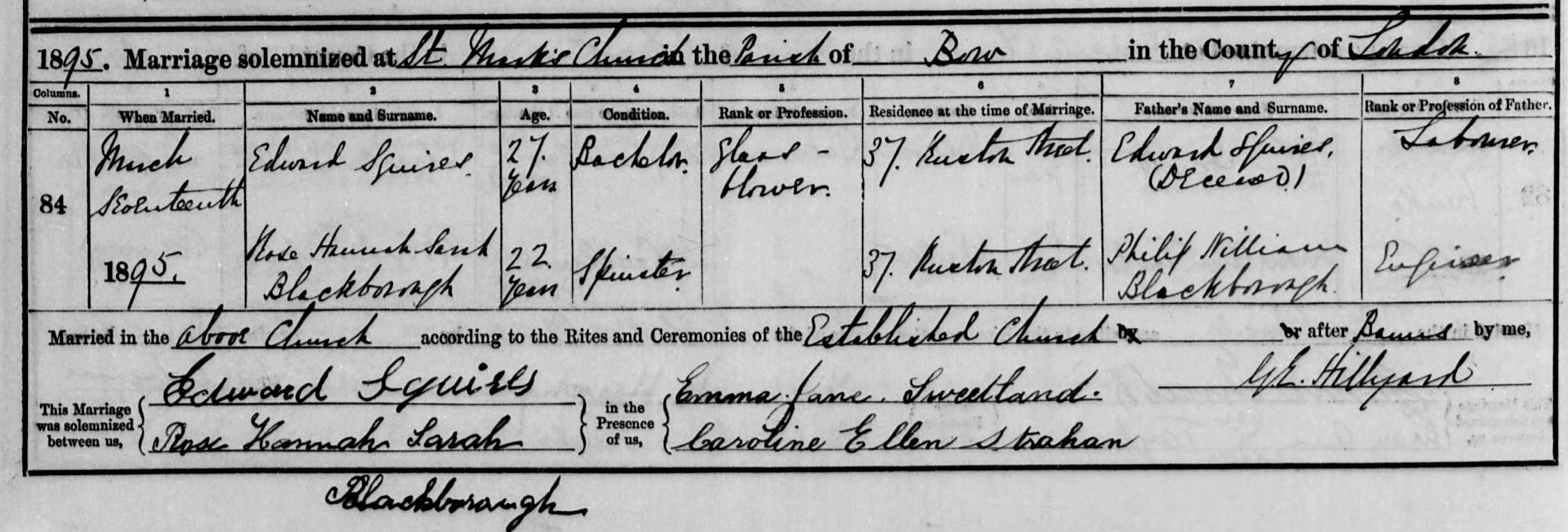 - Edward Squires and Rose Hannah Sarah Blackborough was married on 17 Mar, 1895 at St. Mark's Church, St. Mark Victoria Park, Middlesex, England