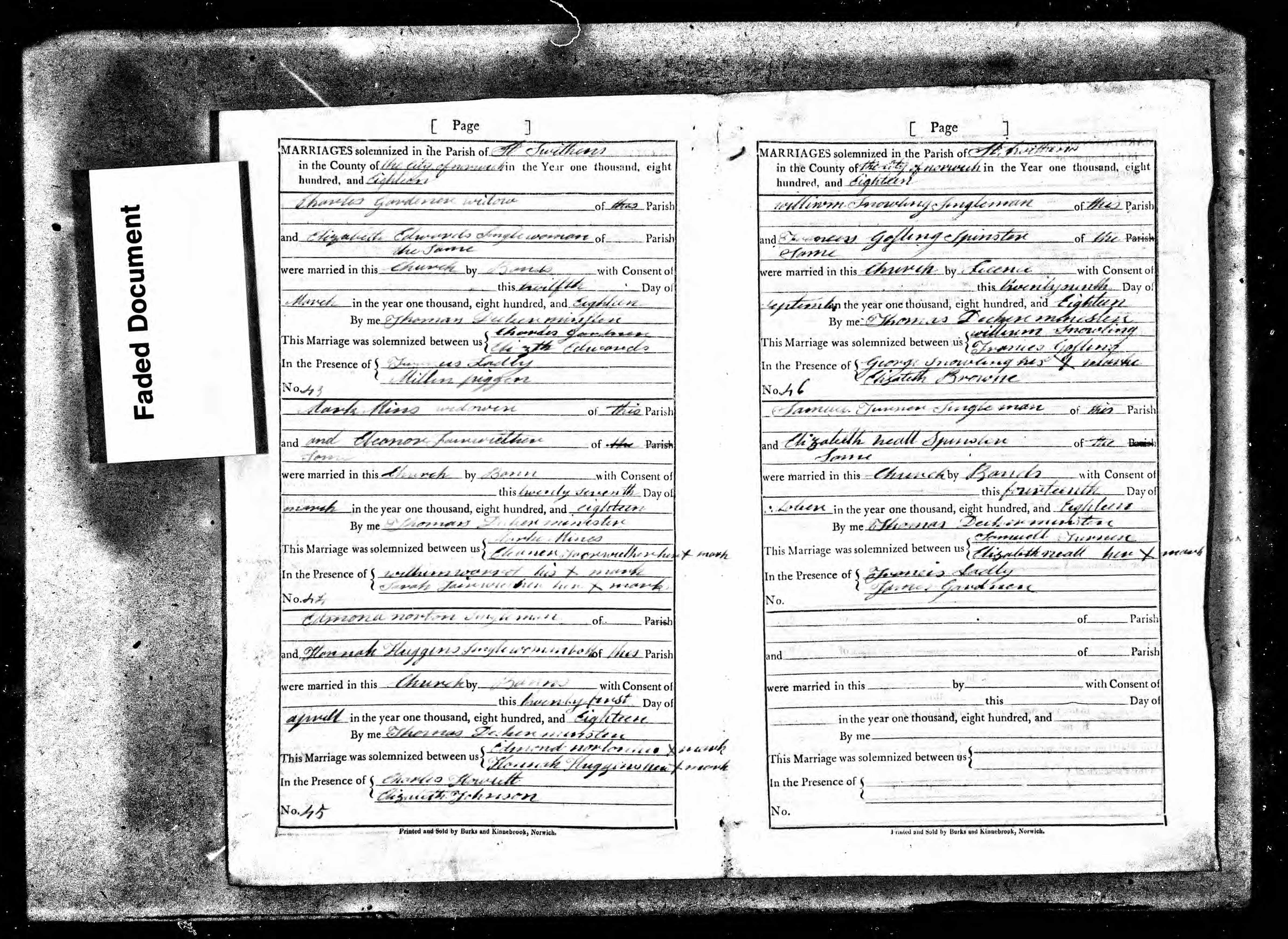 - William Snowling★ and Frances Gosling★ was married on 29 Sep, 1818 in Norwich St. Swithin, Norfolk, England