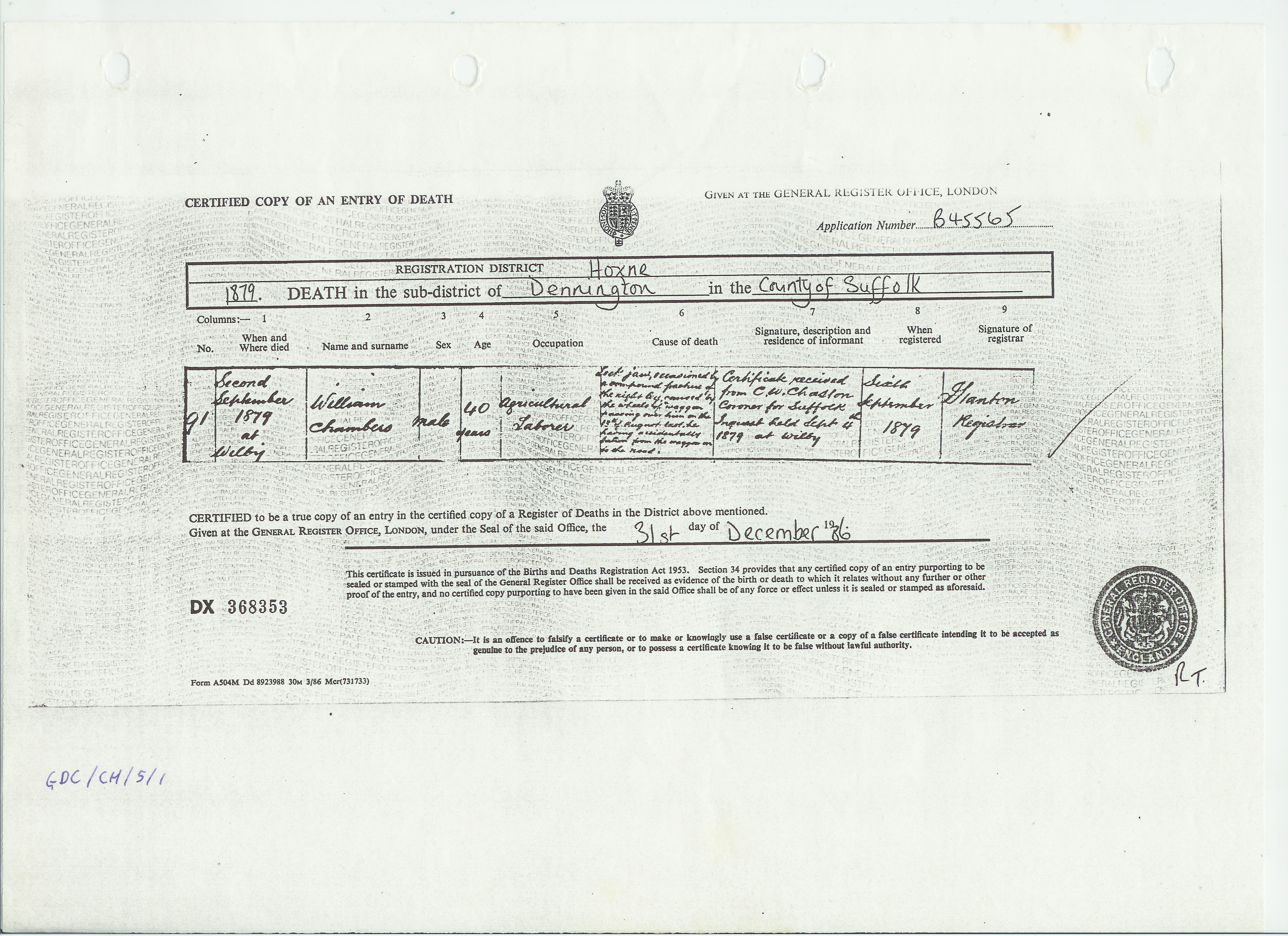 Death in the Registration District of Hoxne, Sub-district of Dennington, Suffolk, 1879, no. 91. Died 2 Sep 1879 at Wilby; William Chambers; Male; age 40; Agricultural labourer. Cause of death: Lock jaw, occasioned by a compound fracture of the right leg caused by the wheels of a wagon passing over him on the 13 August last, he having accidentally fallen from the wagon onto the road.. Informant was C. W. Chaston (signed name); relation: Coroner for Suffolk; was not present at death. The death was registered 6 Sep 1879. Inquest held September 4th 1879 at Wilby