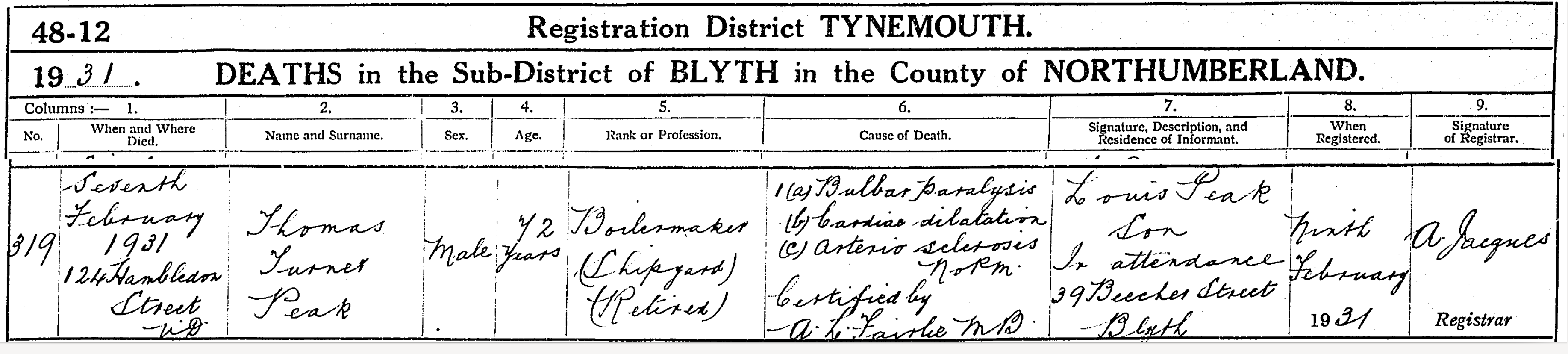 Death in the Registration District of Tynemouth, Sub-district of Blyth, Northumberland, 1931, no. 319. Died 7 Feb 1931 at 124 Hambledon Street; Thomas Turner Peak; Male; age 72; Boilermaker (shipyard) (retired). Cause of death: (a) Bulbar paralysis (b) Cardiac dilation (c) Arterio schlerosis norm. Informant was Louis Peak (signed name); residing at 39 Beecher Street, Blyth; present at death. The death was registered 9 Feb 1931.
