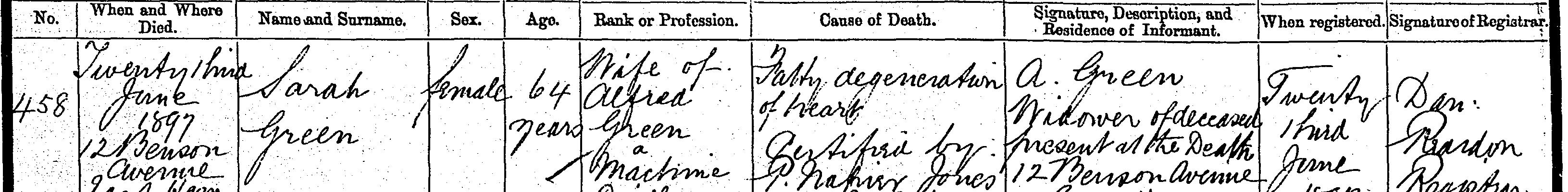 Death in the Registration District of West Ham, Essex, 1897, no. 458. Died 23 Jun 1897 at 12 Benson Avenue, West Ham; Sarah Green; Female; age 64; Wife of Alfred Green a Machine [???]. Cause of death: Fatty degeneration of heart; certified. Informant was A Green (signed name); relation: Husband; residing at 12 Benson Avenue; present at death. The death was registered 23 Jun 1897.