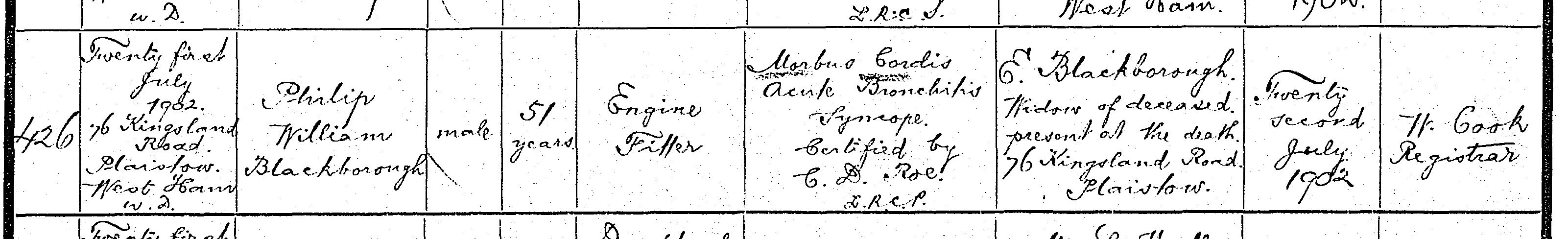 Death in the Registration District of West Ham, Middlesex, 1902, no. 426. Died 21 Jul 1902 at 76 Kingsland Road, Plaistow, West Ham; Philip William Blackborough; Male; age 51; Engine Fitter. Cause of death: Morbus Cordis; Acute Bronchitis; Syncope; Certified. Informant was E. Blackborough (signed name); relation: Wife; residing at 76 Kingsland Road, Plaistow. The death was registered 22 Jul 1902.