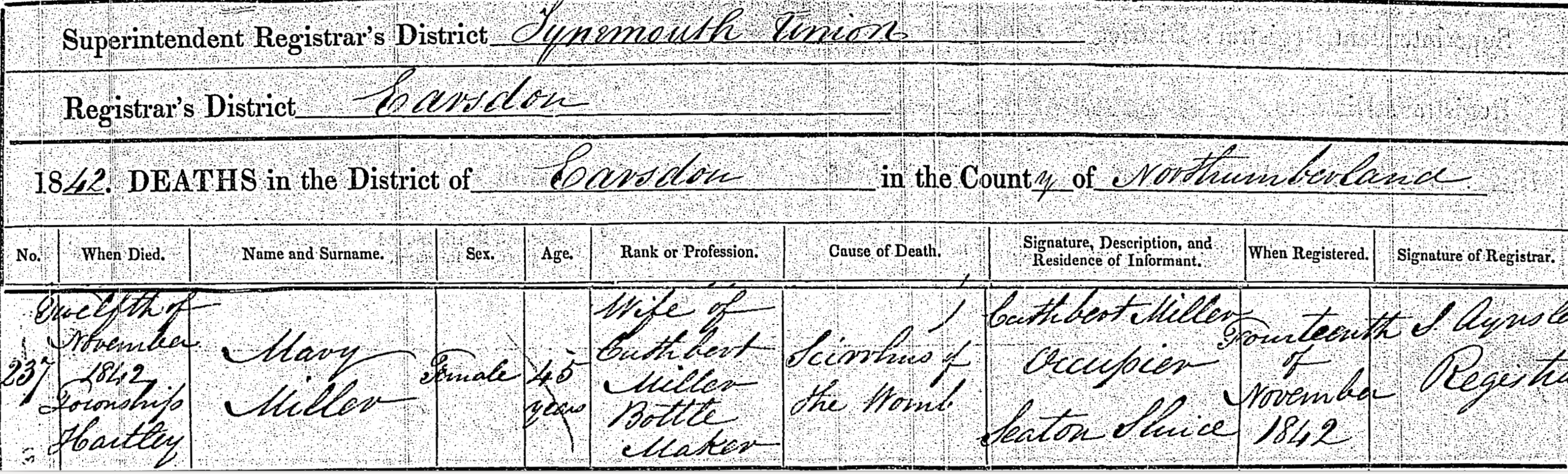 Death in the Registration District of Tynemouth, Sub-district of Earsdon, Northumberland, 1842, no. 237. Died 12 Nov 1842 at Township Hartley; Mary Miller; Female; age 45; Wife of Cuthbert Miller, bottle maker. Cause of death: Scirrhus of the womb. Informant was Cuthbert Miller (signed name); relation: Occupier; residing at Seaton Sluice. The death was registered 14 Nov 1842.