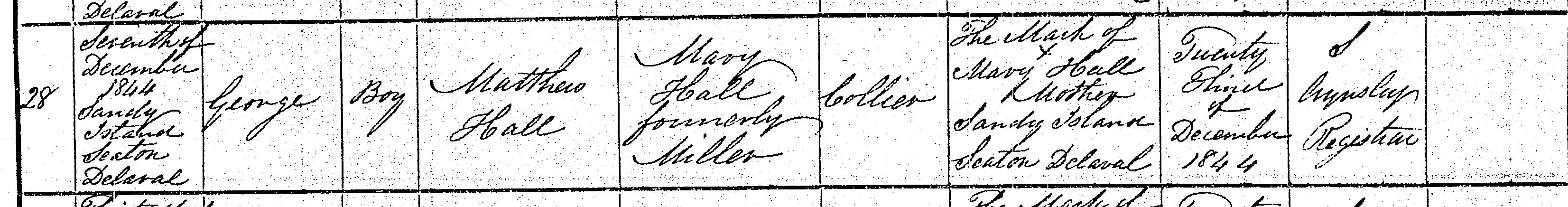 Birth in the Registration District of Tynemouth, Northumberland, 1844, no. 28. Born 7 Dec 1844 at Sandy Island, Seaton Deleval; George Hall; Boy; father Matthew Hall; mother Mary Hall, formerly Miller. Occupation of father: Collier. Informant was Mary Hall; Mother; Sandy Island, Seaton Deleval; could not sign name. The birth was registered 23 Dec 1844.