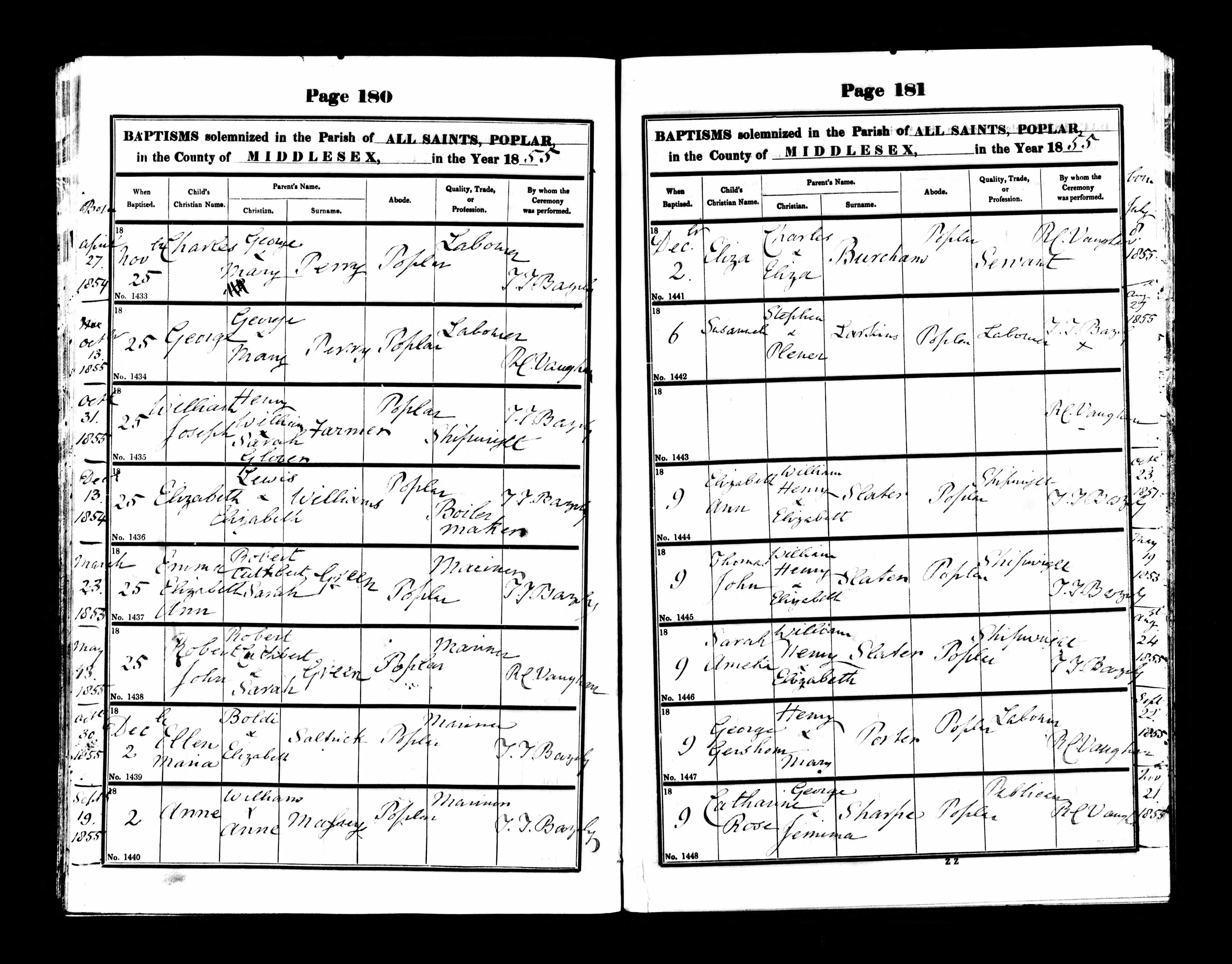 Parish Registers of All Saints, Poplar, Middlesex; Baptism entry for Robert John Green, 25 Nov 1855, Page 180, No 1438.