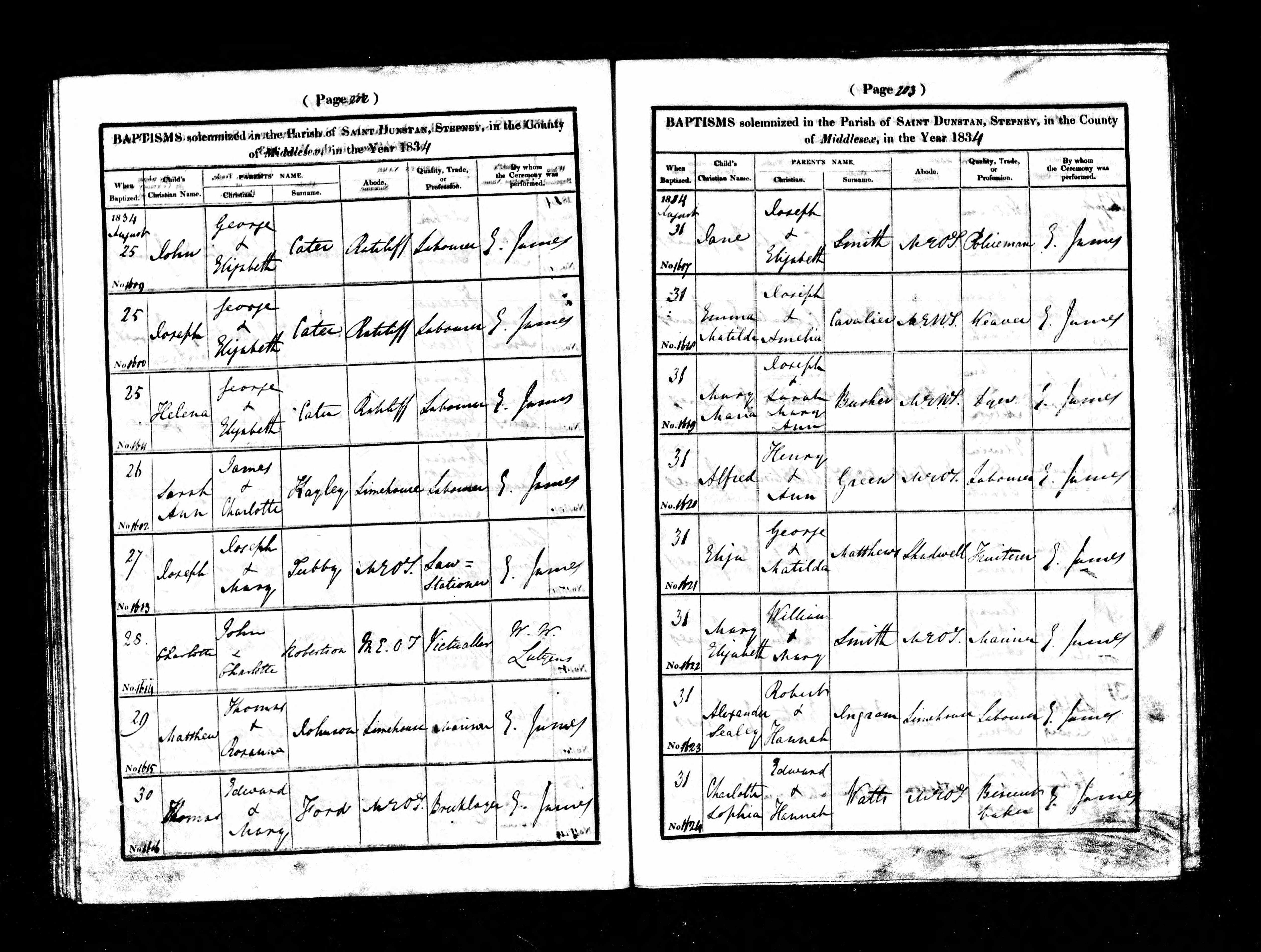 Parish Registers of St Dunstan and All Saints, Stepney, Middlesex; Baptism entry for Alfred Green, 31 Aug 1834, Page 203, No 1620.
