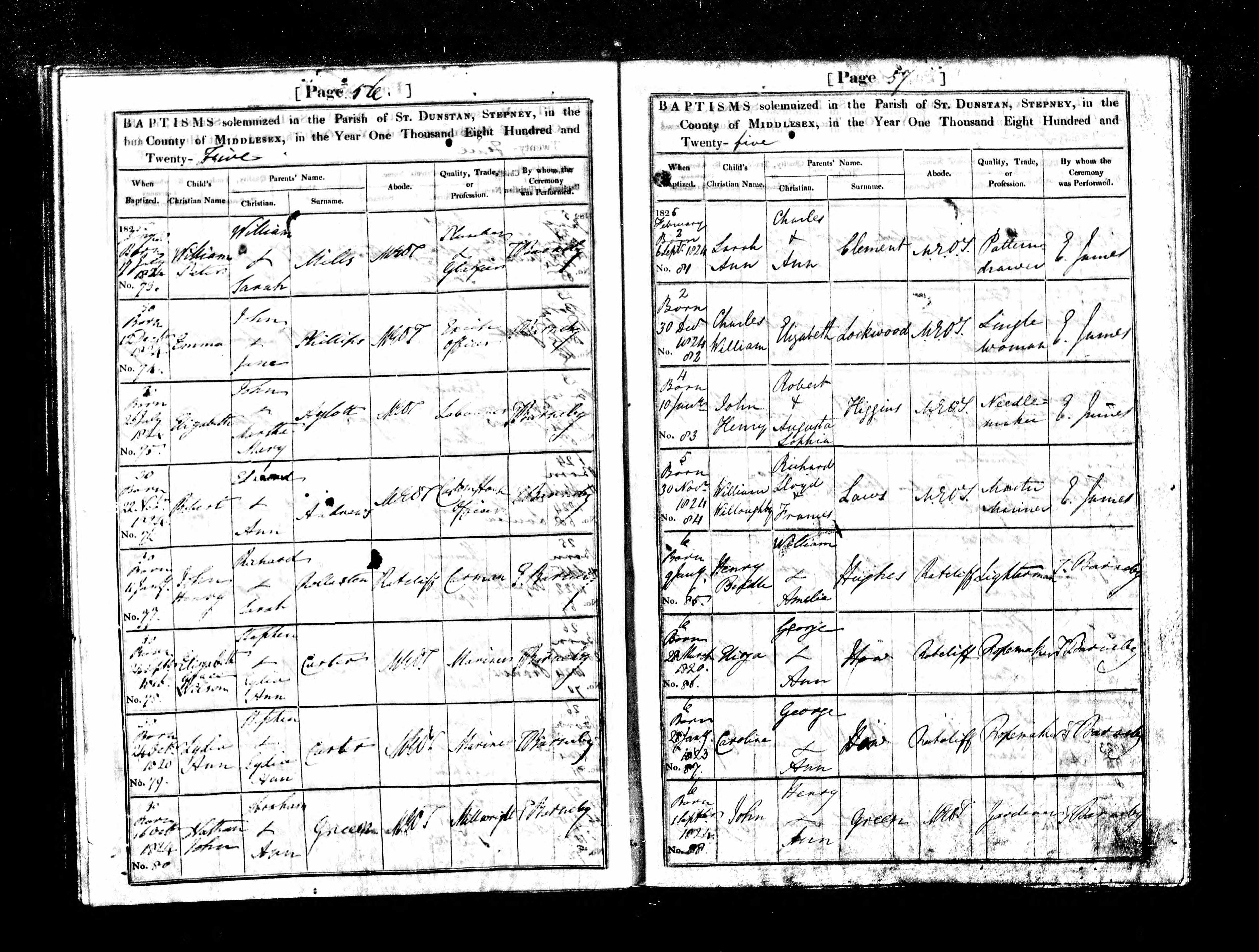 Parish Registers of St Dunstan and All Saints, Stepney, Middlesex; Baptism entry for John Green, 6 Feb 1825, Page 57, No 88.