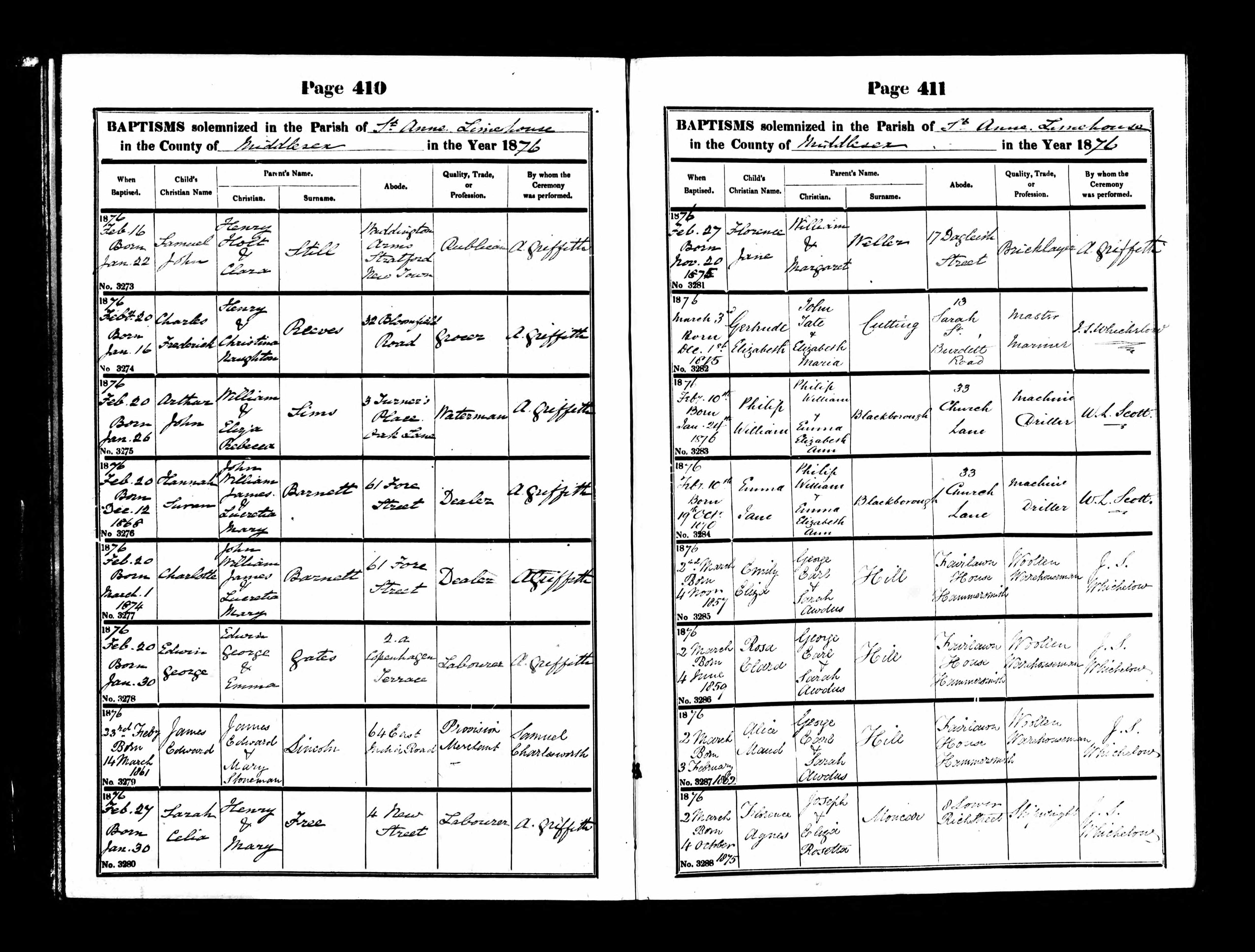 Parish Registers of St Anne, Limehouse, Middlesex; Baptism entry for Emma Jane Blackborough, 10 Feb 1876, Page 411, No 3284.